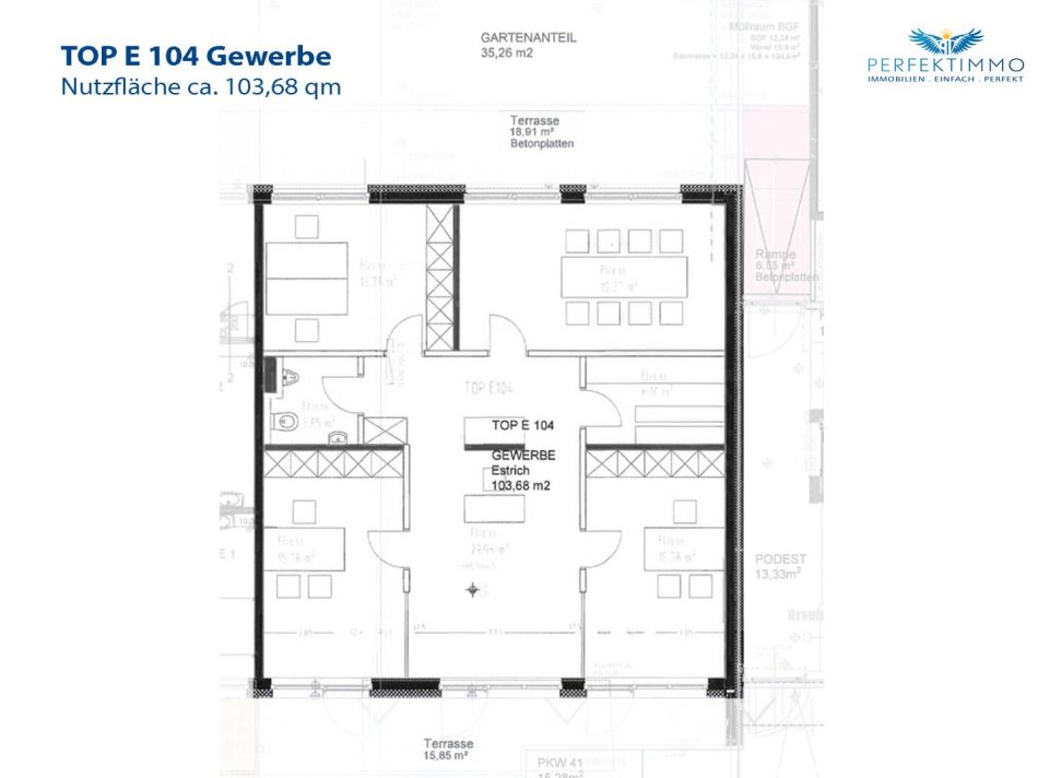 Die Räumlichkeiten bestehen aus fünf Zimmern sowie einem Archiv/Lager und einem WC mit hochwertiger Sanitäreinrichtung. Zu den besonderen Ausstattungsmerkmalen zählen zwei Terrassen und ein privater Gartenabschnitt, die sich ideal für Entspannung oder Kundengespräche im Freien eignen.