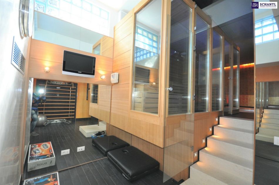 Das Untergeschoss der Villa ist der Entspannung und Freizeit gewidmet, ein wirklich exklusiver Wellnessbereich mit verglaster Sauna, einem türkischen Bad, einem Whirlpool für 6 Personen, einer Erlebnisdusche und einem Fitnessraum. Ebenfalls befindet sich hier die Waschküche, eine prächtige Taverne mit Kamin, welche mit eleganter Holzvertäfelung ausgestattet wurde, sowie der Weinkeller welcher ebenfalls mit geschnitztem Kiefernholz verkleidet wurde, die Serviertheke und der Zapfhahn für Bier und Wein.
