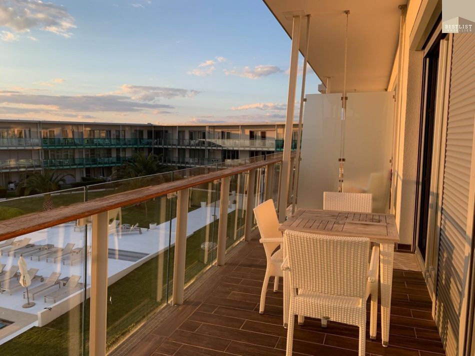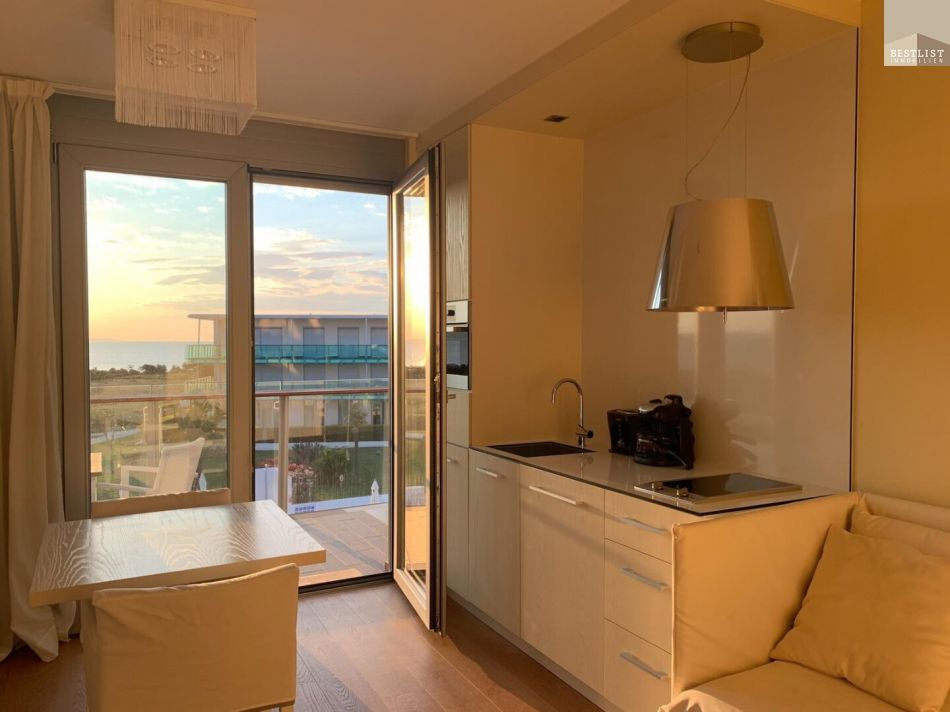 Die Wohnung liegt in einem modernisierten Gebäude innerhalb der Anlage und eignet sich ideal für zwei Personen. Sie verfügt über ein Schlafzimmer, ein modernes Badezimmer sowie einen offenen Wohn-Essbereich mit gut ausgestatteter Küchenzeile. Der Balkon lädt zum Verweilen ein – genießen Sie hier die frische Meeresluft und den Blick ins Grüne.
