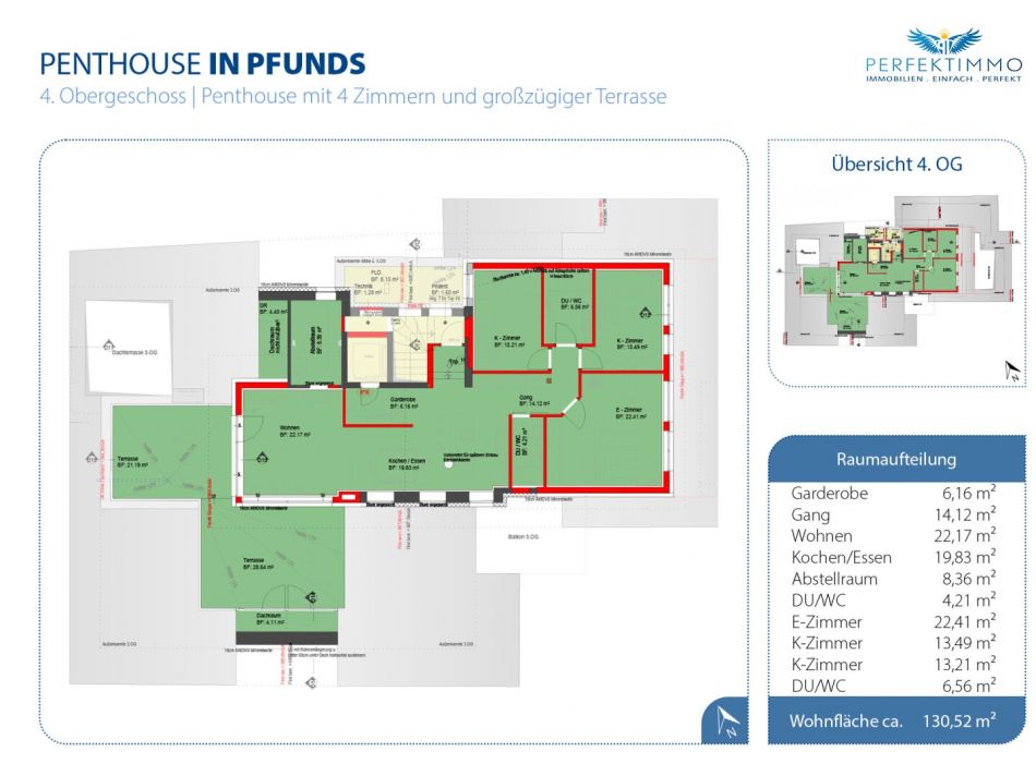 großzügige Terrasse – modernes Wohnen über den DächernDiese hochwertig geplante Penthouse-Neubauwohnung im 4. Obergeschoss eines modernen Wohngebäudes aus dem Baujahr 2025 vereint großzügiges Wohnen, zeitgemäße Architektur und naturnahe Lebensqualität zu einem besonders attraktiven Zuhause für Familien und Menschen mit hoher Wohnqualitätserwartung. Auf einer Wohnnutzfläche von ca. 130,52 m² eröffnet sich ein durchdachtes Raumkonzept mit vier Zimmern, das ausreichend Platz für gemeinsames Familienleben ebenso wie für individuelle Rückzugsbereiche bietet. Durch die Lage im obersten Geschoss genießen Sie ein exklusives Wohngefühl mit viel Ruhe, Privatsphäre und angenehmer Helligkeit, die den Wohnkomfort im Alltag deutlich steigert.