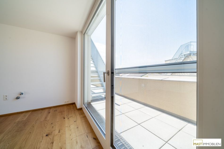 Die Wohnung befindet sich im 2. Liftstock (Dachgeschoss) und verfügt über 67,11 m² Wohnfläche + eine 15,61 m² große Terrasse + eine 49,59 große Dachterrasse / Gründach.