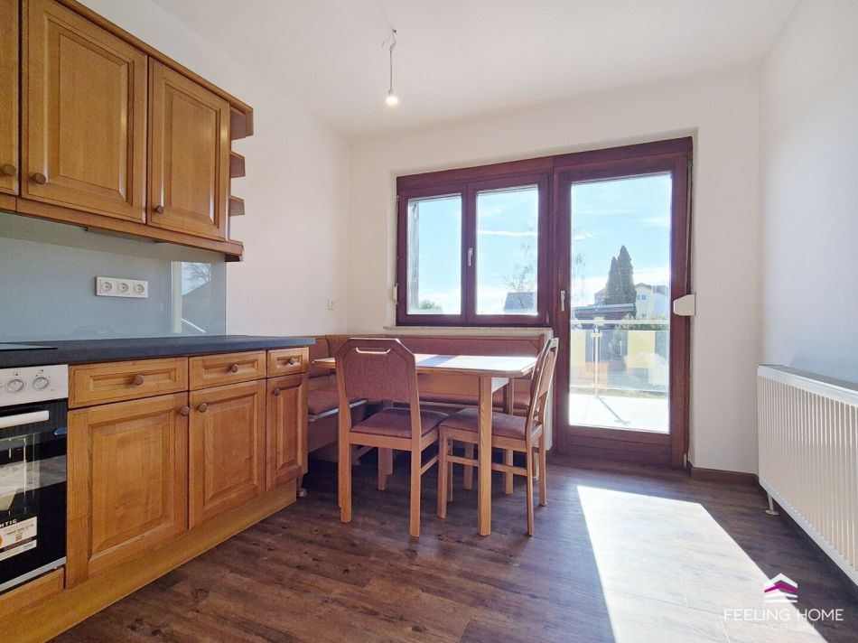 Die geräumige, südost-ausgerichtete Terrasse mit elegantem Glas-Geländer lädt zu entspannten Stunden im Freien ein und verbindet das Wohnen nahtlos mit dem wunderschönen Garten. Der neue Vinylboden in den Wohnräumen sowie die frisch verlegten Fliesen im Außenbereich sorgen für ein frisches, modernes Erscheinungsbild.