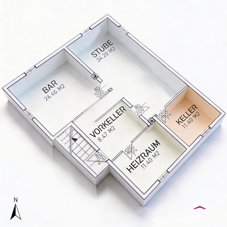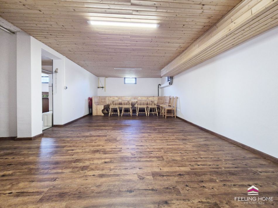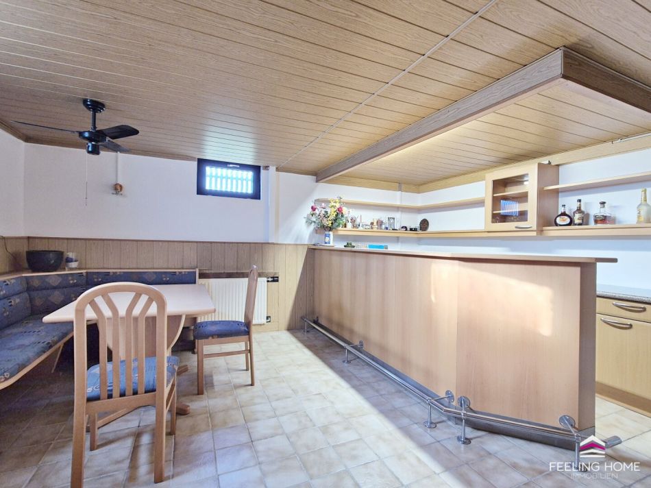 Der Vollkeller mit ca. 87,73 m² bietet weit mehr als nur Stauraum. Eine vollständige Bar, eine große und einladende Kellerstube für gesellige Abende und private Partys sowie ein Heizraum und ein Stauraum gestalten diesen Bereich zu einem echten Mehrwert der Liegenschaft.