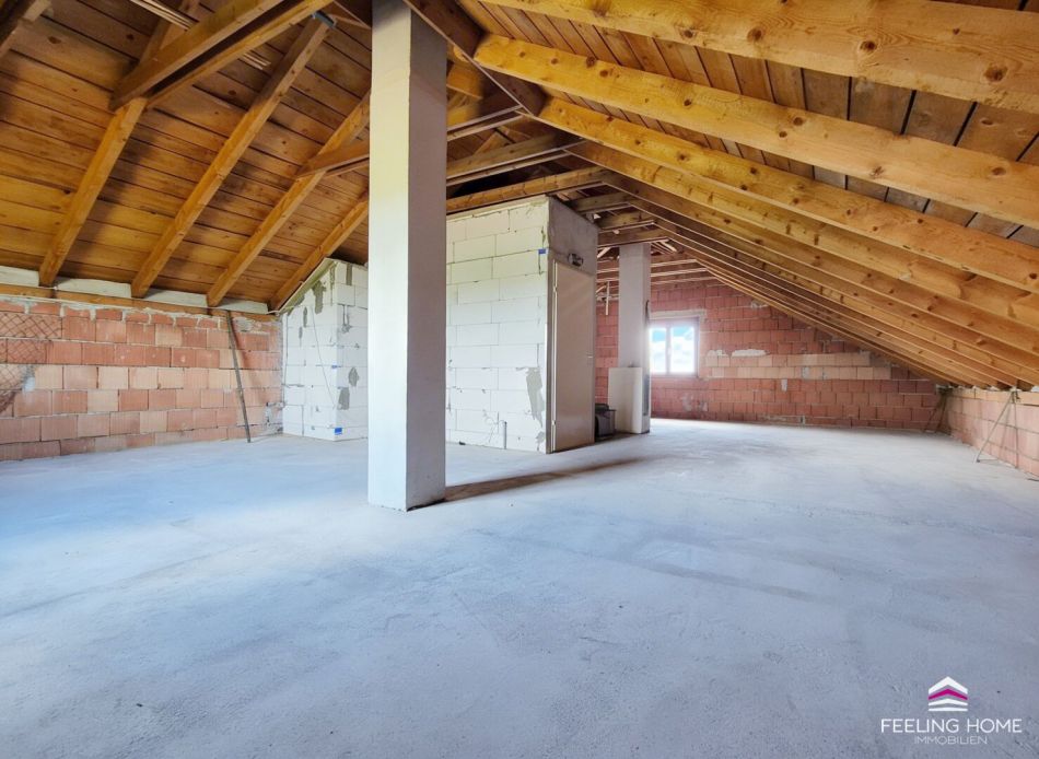 Der Rohdachboden bietet eine hervorragende Grundlage für eine individuelle Erweiterung des Wohnraums. Ob zusätzliche Schlafzimmer, ein Home-Office oder ein Hobbybereich – die Möglichkeiten sind vielfältig.