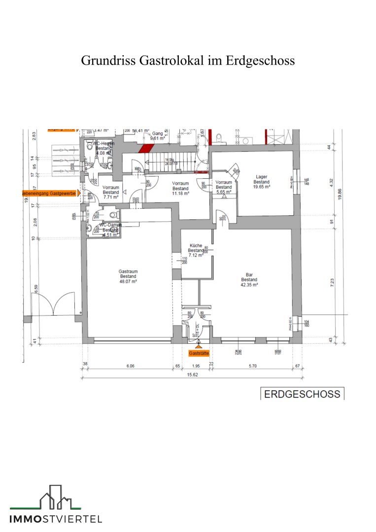 * Raumaufteilung ( Gastraum, Extrazimmer, Küche, Vorbereitungsraum, Vorraum, WC Damen und WC Herren, )