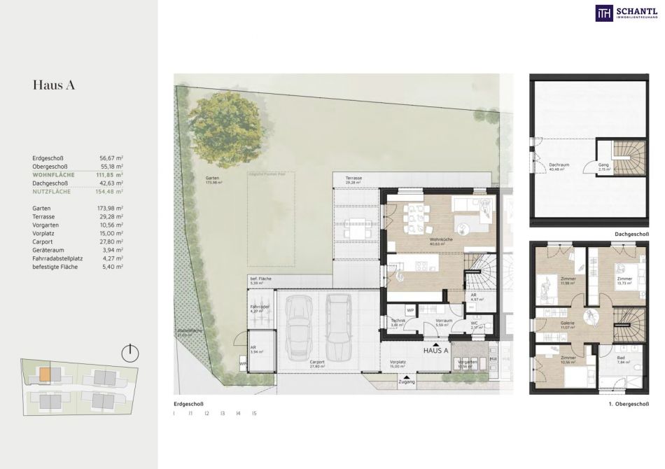 Die effiziente Holzbauweise hilft, die Herstellungskosten im Griff zu behalten und bietet eine solide Basis für leistbaren Wohnraum, ohne Abstriche bei Qualität oder Wohngefühl. Carports, überdachte Fahrradplätze, eigene Abstellräume, Pergolas und eine Luft/Wasser‑Wärmepumpe gehören fix zum Konzept und erleichtern die Umsetzung.