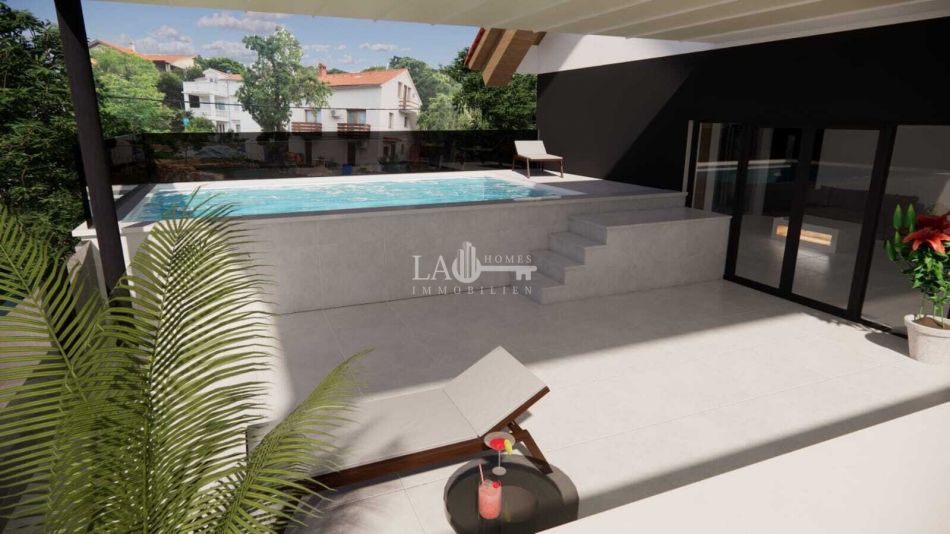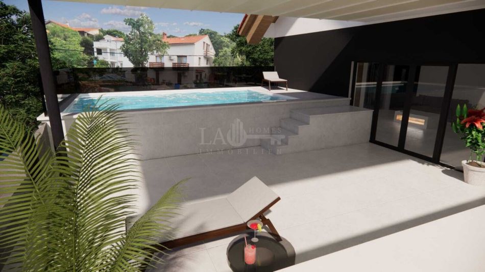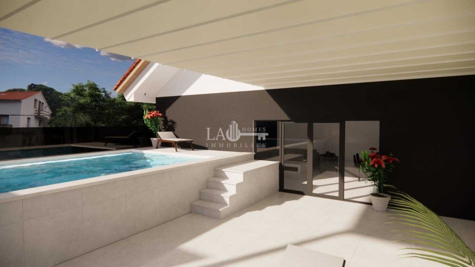 Durch eine breite Schiebetüre, die zum Außenbereich mit einer großen Terrasse und einem Swimmingpool geplant ist , wird es viel natürliches Licht geben.