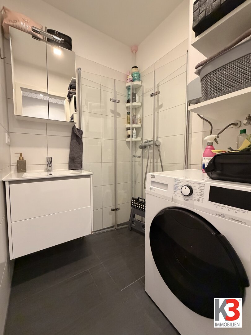 Das Badezimmer wurde modernisiert und verfügt über eine Dusche, sowie einen Waschmaschinenanschluss. Die voll ausgestattete Einbauküche bietet praktische Arbeitsflächen und ausreichend Stauraum.