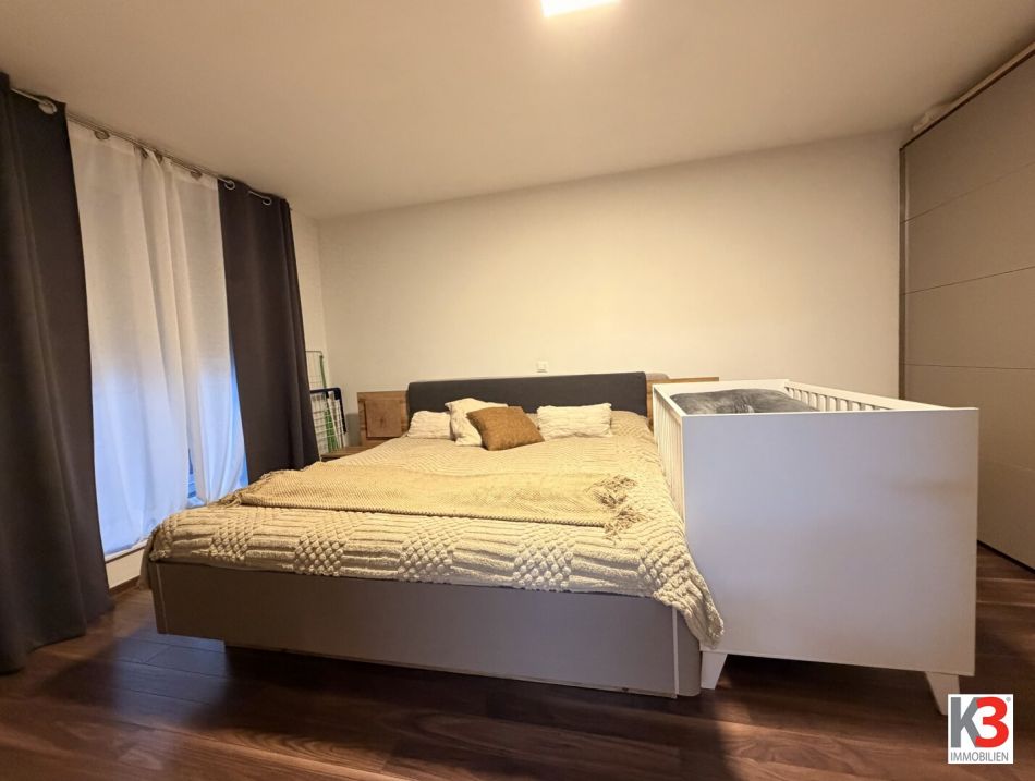 Das großzügige Wohnzimmer bildet den Mittelpunkt der Wohnung und bietet Platz für Wohn- und Essbereich. Neben dem geräumigen Schlafzimmer steht ein weiterer Raum zur Verfügung, ideal als Kinderzimmer, Gästezimmer oder Büro.