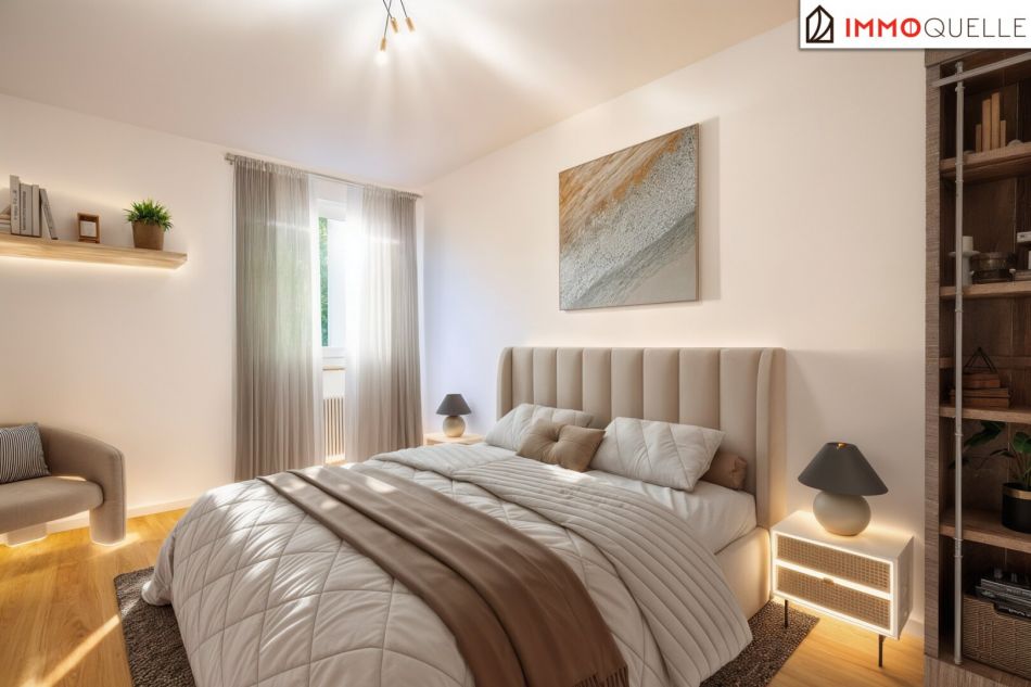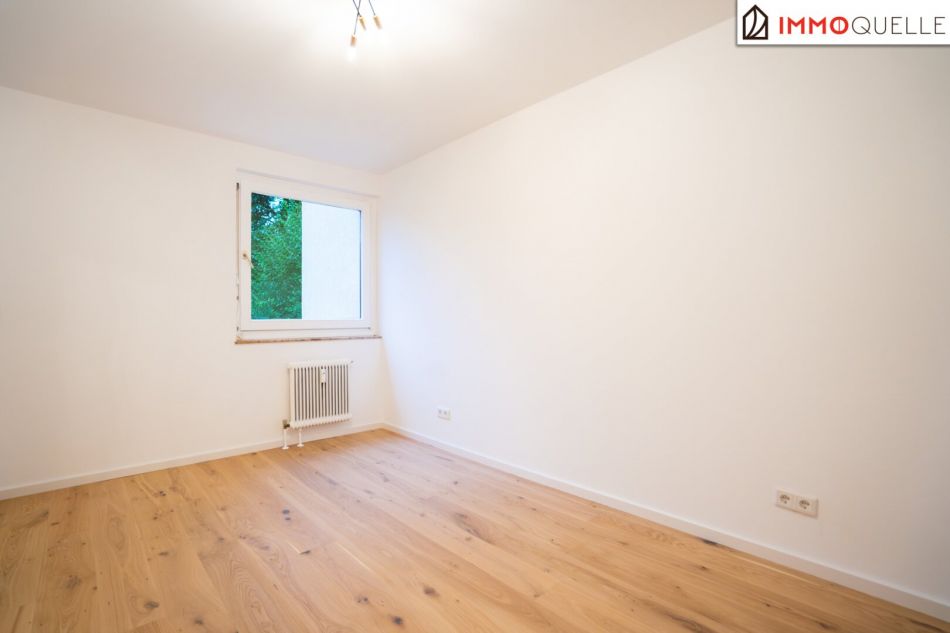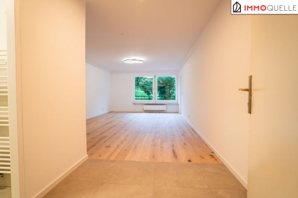 Rechts vom Wohnbereich gelangen Sie ins Schlafzimmer, das durch ein Fenster ebenfalls einen beruhigenden Grünblick bietet. Die gesamte Wohnung wurde mit viel Liebe zum Detail kernsaniert: neue Elektrik, neue Wasserleitungen, hochwertiger Bodenbelag, neue Fliesen, Markenarmaturen – alles ist sofort bezugsbereit.