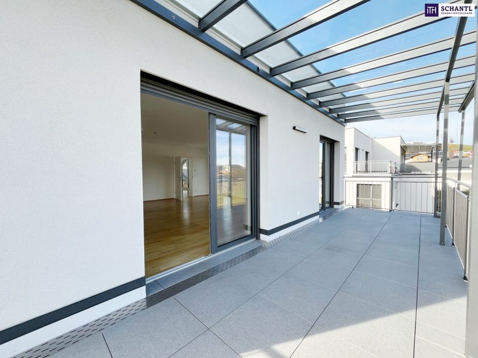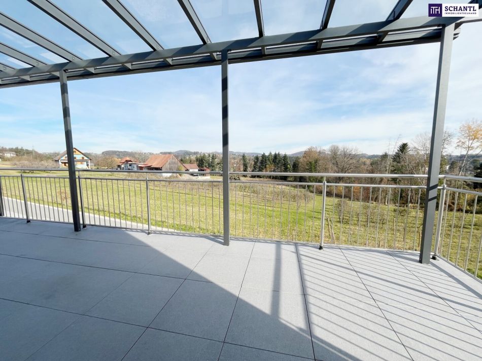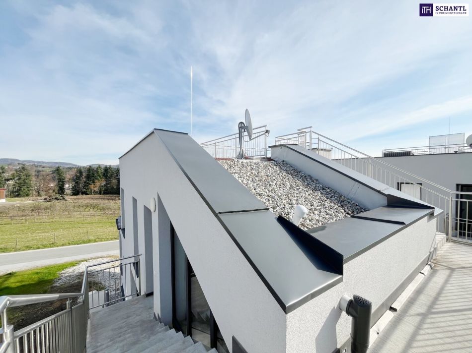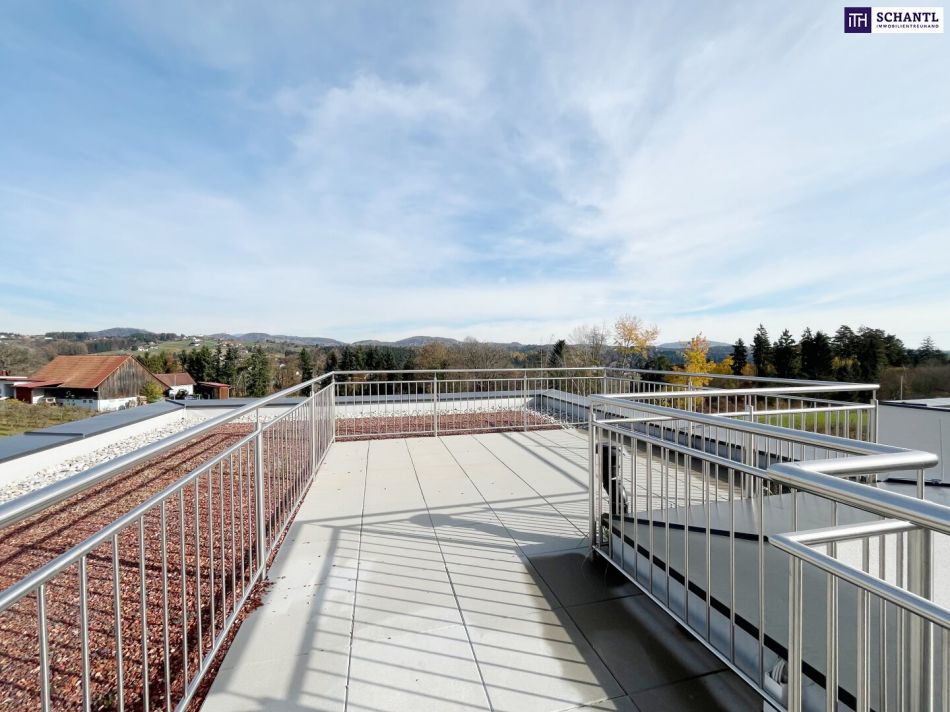 - 360°-Panorama-Dachterrasse mit ungefähr 60m², Wasseranschluss und Blick über die steirischen Weinberge