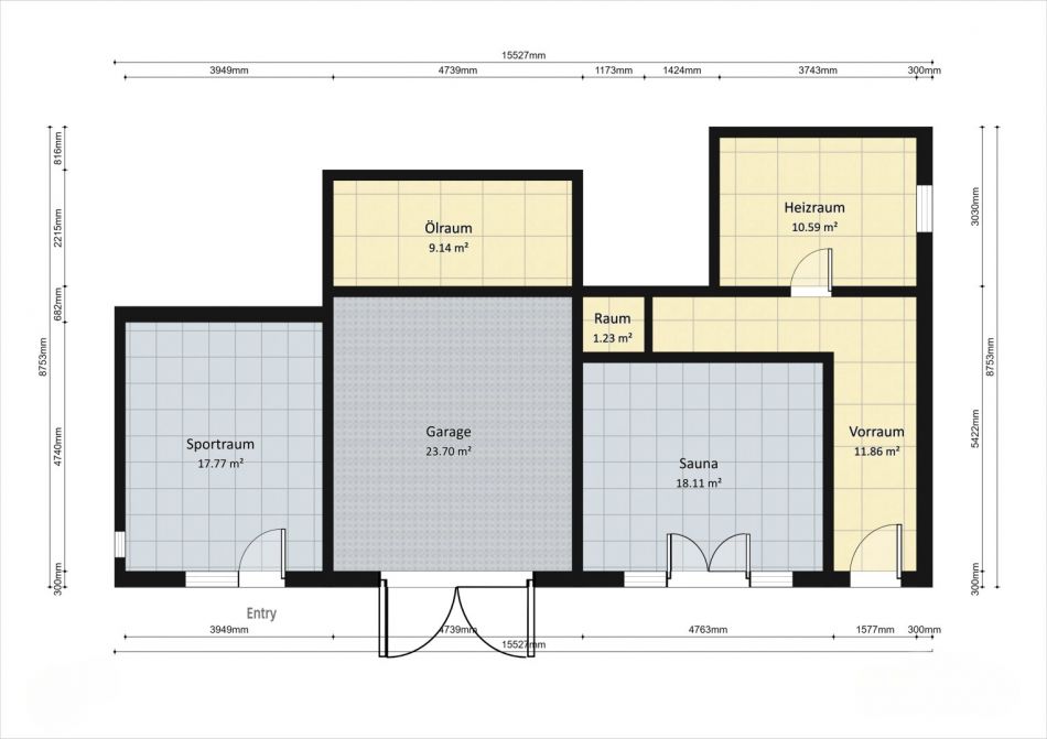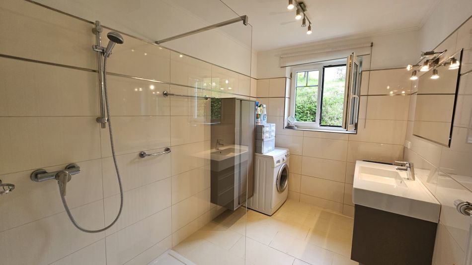 Untergeschoss (ca. 120m2): Keller mit Heizraum (Öl-Zentralheizung auf Holz umschaltbar), Saunaraum mit Dusche, Sportraum mit Fitnessgeräten, Garage für 2 PKW geeignet.