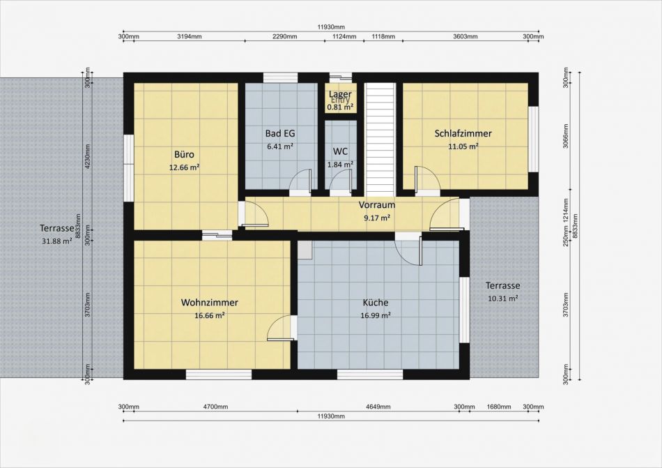 Wohngeschoss (ca. 95m2): zentrales Vorzimmer, Wohnküche, Wohnzimmer mit Kamin, 2 Schlafzimmer, modernes Bad mit Fenster, WC extra, zuzügl. 2 Terrassen (ostseitig und große Westterrasse)