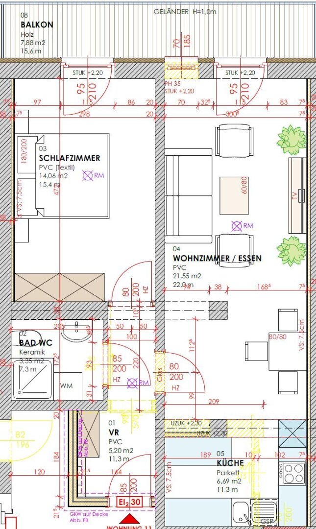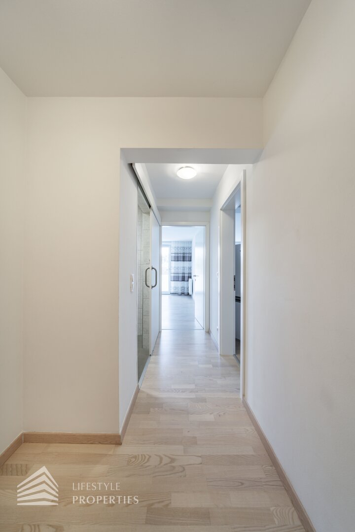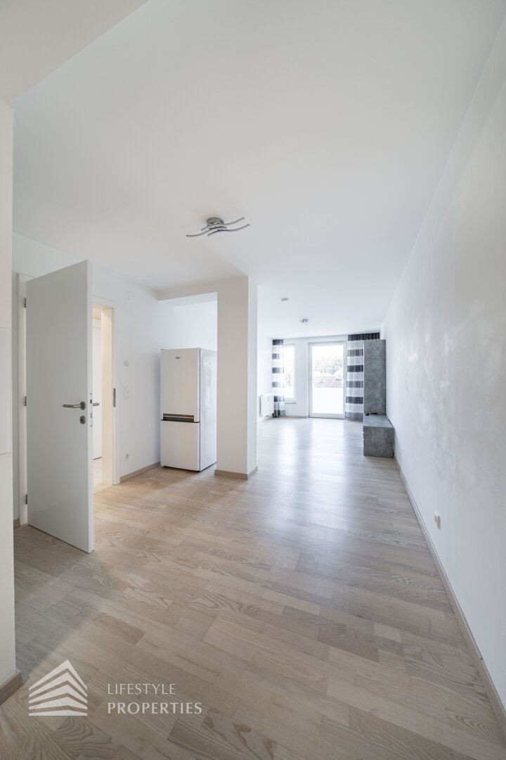 Die Immobilie befindet sich im 1. OG eines vierstöckigen Gebäudes und hat ca. 53,76 m². Diese Wohnung bietet sich ideal für Pärchen oder Singles an. Sie betreten die Wohnung durch einen ca. 5,20 m² großen Vorraum; von hier aus erreichen Sie sämtliche Räume der gemütlichen 2-Zimmer Wohnung. Links finden Sie das Badezimmer, welches über eine Dusche, eine Toilette und einen Waschmaschinenanschluss verfügt. Geradeaus finden Sie das Schlafzimmer, rechts die Wohnküche. Letztere bietet mit ihren ca. 21,55 m² ausreichend Platz zum Wohnen und Wohlfühlen. Das Schlafzimmer hat ca. 14,06 m² und beide Zimmer verfügen über einen Zugang zu dem großzügigen, ca. 7,88 m² großen Balkon. Sämtliche Wohnräume sind mit einem wunderschönen Parkettboden, das Badezimmer mit hochwertigen Fliesen verlegt.