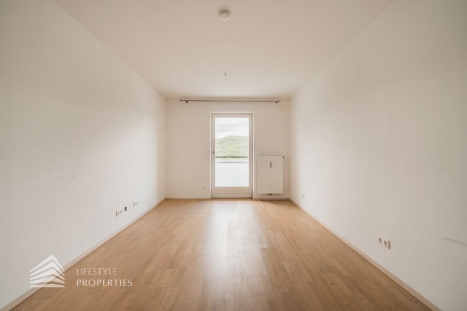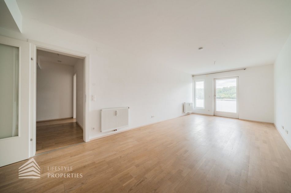 Die Immobilie befindet sich im 2. OG eines vierstöckigen Gebäudes und hat eine Größe von ca. 63,88 m². Sie betreten die Wohnung und gelangen in einen geräumigen, U-förmigen Vorraum mit ca. 11,83 m². Dieser bietet aufgrund seiner Größe ausreichend Platz für jegliche Garderobe. Von hier aus haben Sie außerdem die Möglichkeit jeden Raum der Wohnung getrennt zu begehen. Unmittelbar auf der rechten Seite finden Sie eine Tür, welche zu dem Abstellraum führt. Etwas weiter, ebenfalls auf der rechten Seite, finden Sie das Badezimmer, welches über eine Dusche, eine Toilette und einen Waschmaschinenanschluss verfügt. Zwei weitere Türen, am Ende des Vorraumes, führen zum Schlafzimmer und zur Wohnküche. Die 21,54 m² große Wohnküche stellt das Herzstück der Wohnung dar und verfügt über einen Zugang zu dem ca. 7,47 m² großen Balkon mit Blick in die Natur. Die Küche ist vom Wohnbereich des Zimmers räumlich durch eine Trennwand abgegrenzt. Das ca. 17,85 m² große Schlafzimmer, welches ebenfalls über einen Zugang zum Balkon verfügt, befindet sich direkt nebenan. Sämtliche Zimmer sind mit einem wunderschönen Parkettboden, das Badezimmer mit hochwertigen Fliesen verlegt.