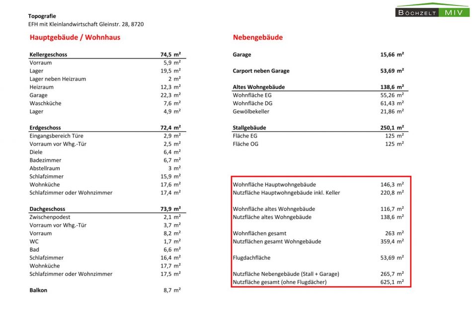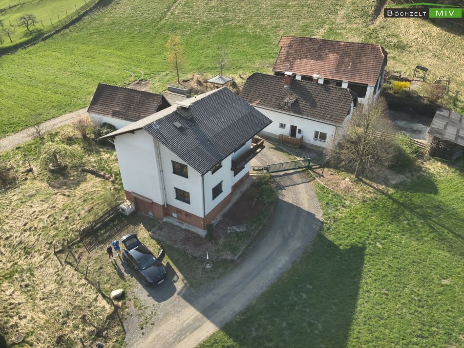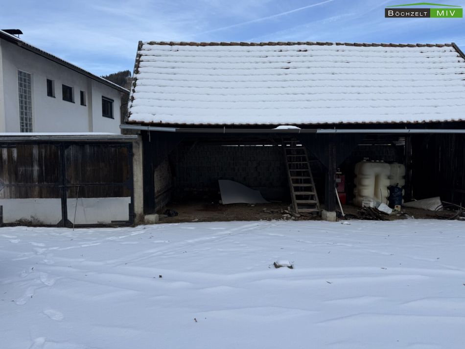 Auf der Liegenschaft gibt es zahlreiche Nebengebäude: Östlich des Wohngebäudes wurde eine Einzelgarage (ca. 16 m²) errichtet an die ein knapp 54 m² großes Carport mit darüberliegender Lagerungsmöglicheit grenzt, welches genügend Platz für Ihre Autos schafft. Unmittelbar gegenüber des eigentlichen Wohnhauses ist das ehemalige, sanierungsbedürftige Wohngebäude situiert. Dieses weist eine Wohnfläche von knapp 117 m², sowie 22 m² Kellerfläche (Gewölbe) auf und ist sanierungsbedüftig. Nach der erfolgten Sanierung könnte dieses als Wohnhaus zur Vermietung, Ferienwohnung oder Wohnsitz für andere Familienmitglieder dienen. Im südlichsten Bereich der Liegenschaft befindet sich das Stallgebäude, welches eine Fläche von knapp 250 m² auf 2 Geschossen vorzuweisen hat.