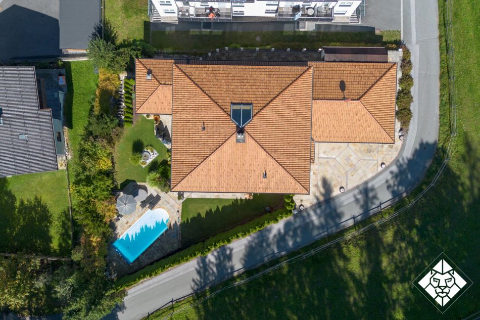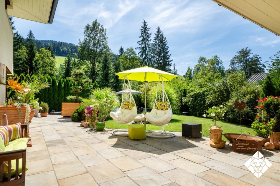Die klare Linienführung im toskanischen Stil, kombiniert mit Naturstein, Holz und lichtdurchfluteten Übereck-Fenstern, schafft ein Ambiente, das gleichermaßen repräsentativ wie wohnlich wirkt. Ein überdachter Außensitz lädt dazu ein, die immer wärmer werdenden Alpen-Sommer stilvoll geschützt zu genießen. Im Winter öffnet sich der Blick auf die verschneiten Hänge, während im Sommer das satte Grün der Natur den Rahmen für Ruhe und Entspannung bildet.