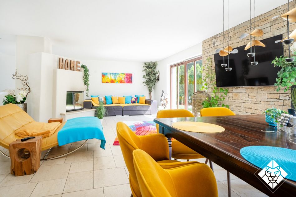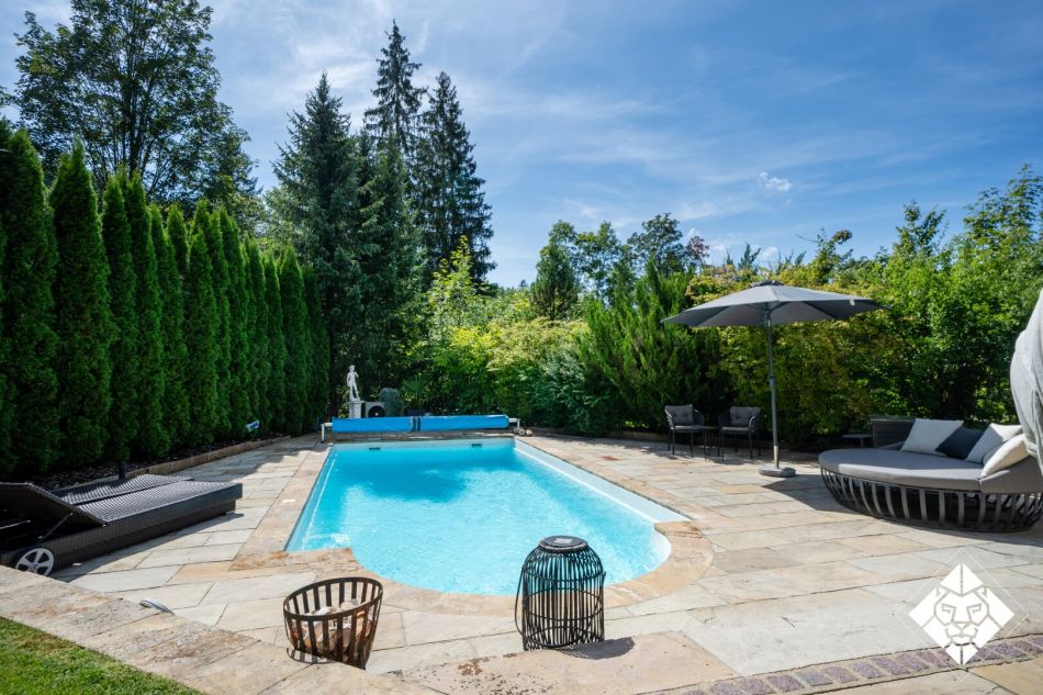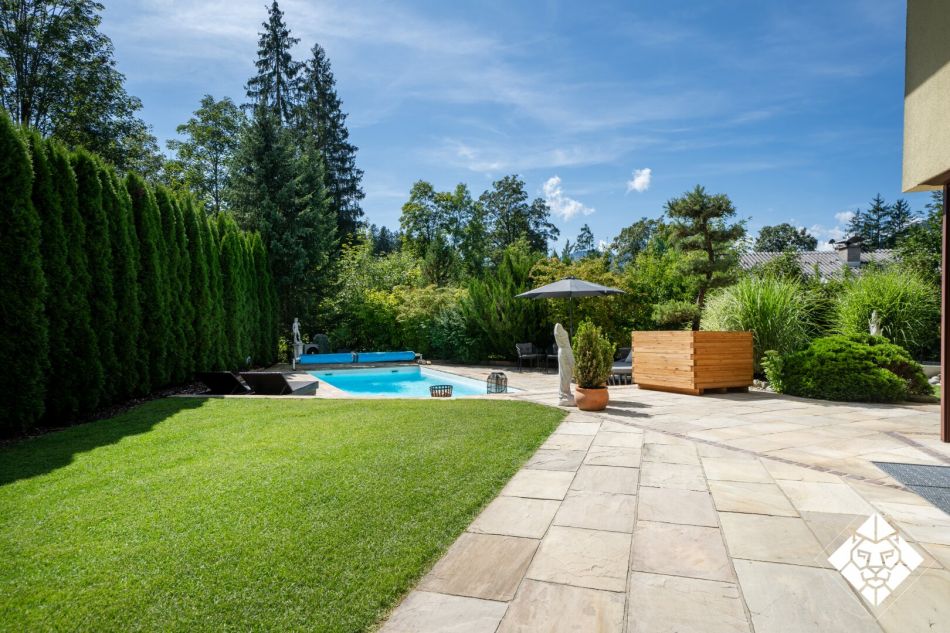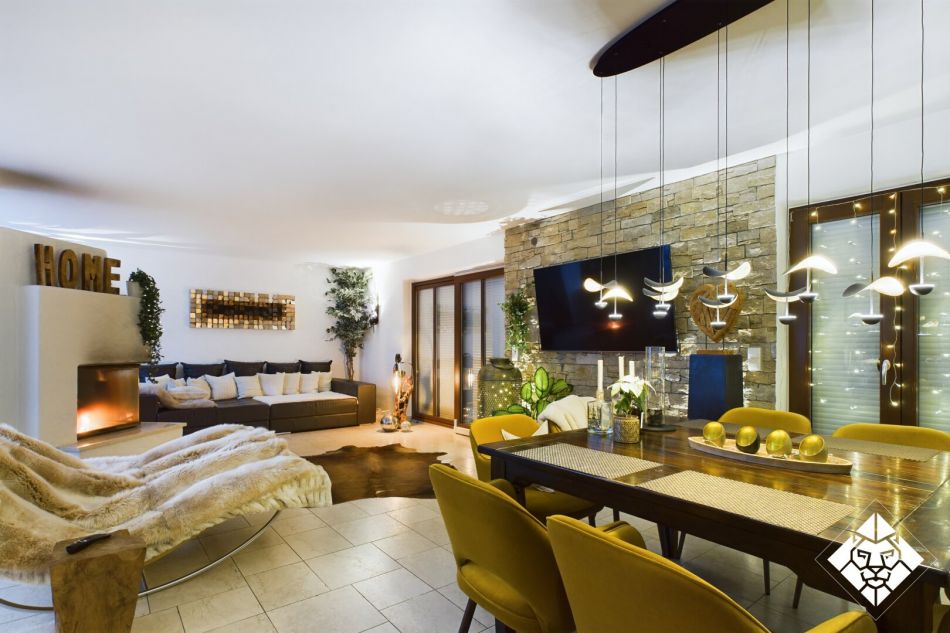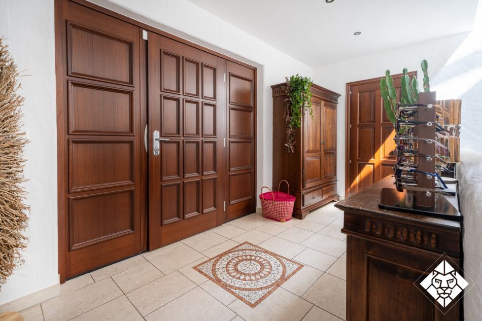 Das Haus bietet eine Wohnfläche von ca. 347 qm, ergänzt durch großzügige Terrassen, eine Doppelgarage, Abstellflächen sowie hochwertig ausgeführte Innenräume. Bodentiefe Fenster, edle Stein- und Parkettböden, Fußbodenheizung, Kamin sowie ein beheizter Außenpool mit Wellnessanschluss garantieren ein Wohngefühl auf höchstem Niveau. Jeder Raum ist durchdacht gestaltet und mit Materialien von erlesenster Qualität ausgestattet.