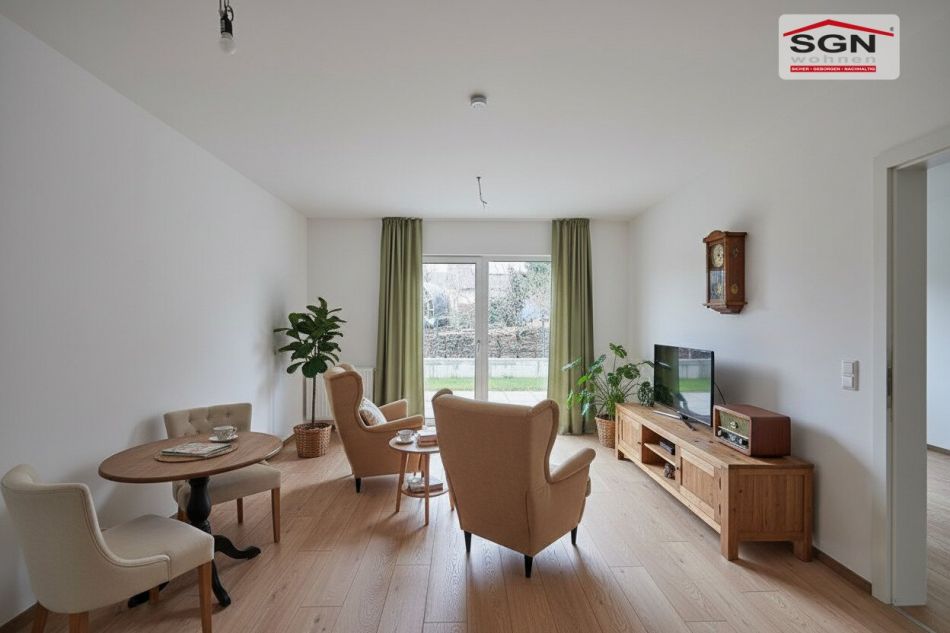 Ein geräumiger Wohn-Küche-Bereich wird aufgrund der Terrassentüre zum Garten ausreichend belichtet. Die Wohnung ist Richtung S/W ausgerichtet. Zur Beschattung sind elektrische Außenrollläden vorhanden.