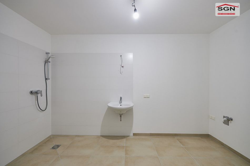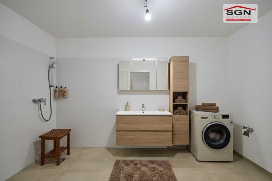Das Badezimmer ist mit Waschbecken, bodenebener Dusche und WC ausgeführt. Eine Anschlussmöglichkeit für die Waschmaschine ist vorhanden.