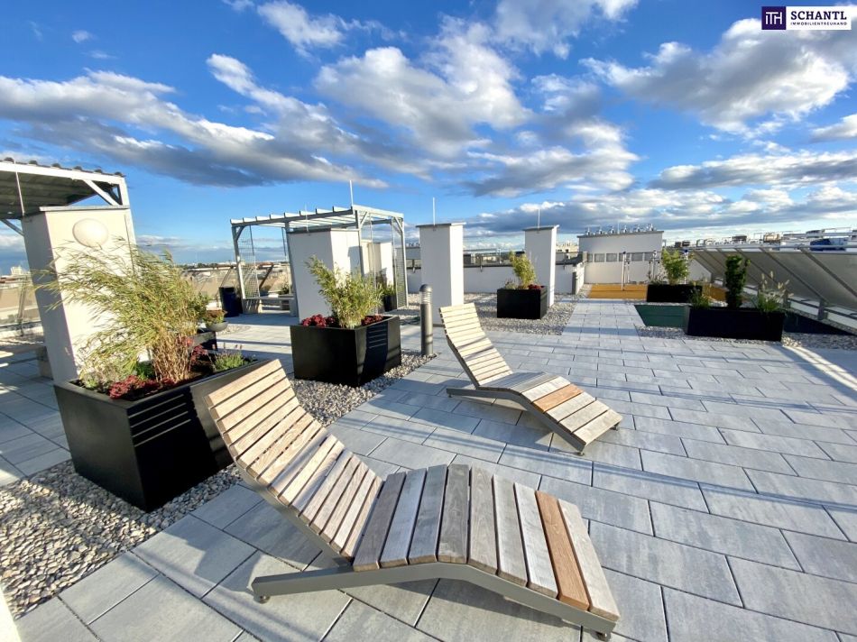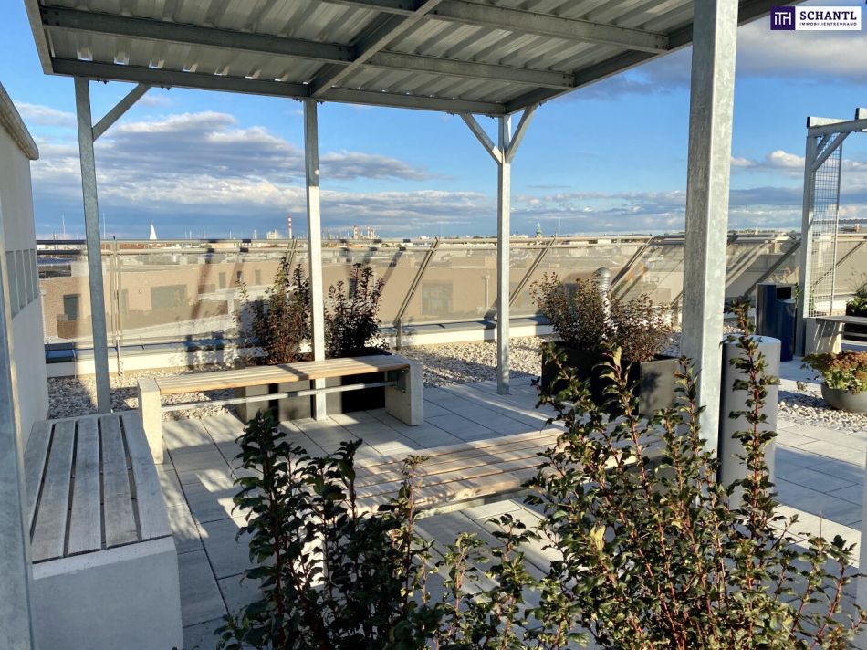 Highlight: Genießen Sie die große hauseigene Dachterrasse mit dem wunderbaren Fernblick, die den Mietern exklusiv zur Verfügung steht. Hier entspannen Sie in den Chillout-Bereichen, machen Sport auf den aufgestellten Fitnessgeräten, oder nutzen den integrierten Weichboden für Yoga.