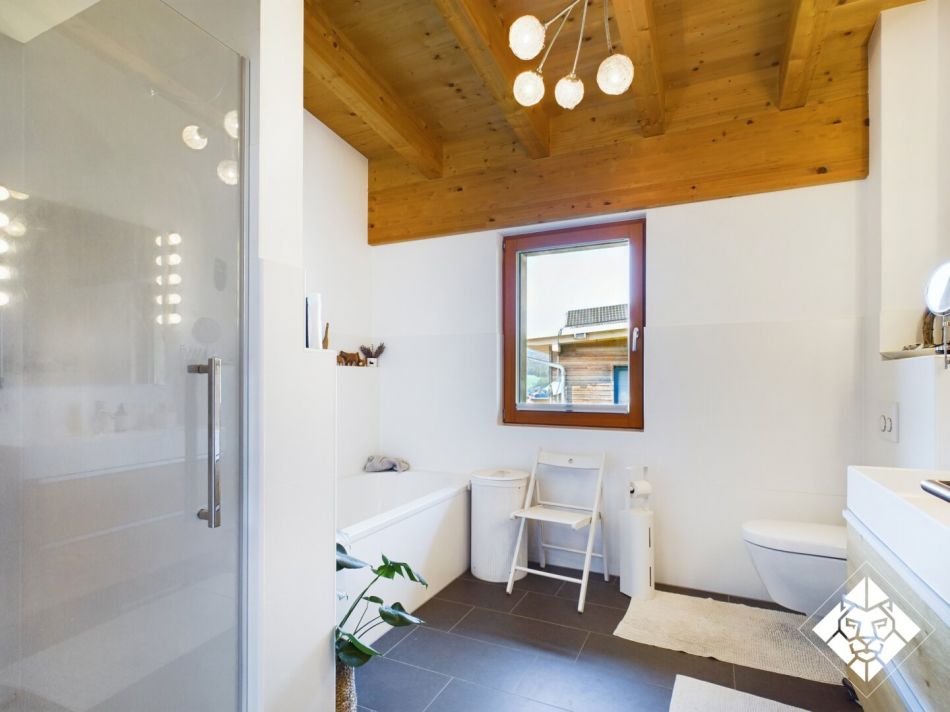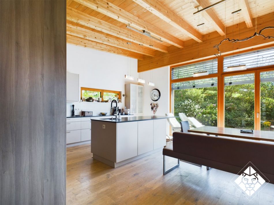 Das Haus selbst überzeugt durch seine nachhaltige Hybridbauweise, die sich im Holzbau des Obergeschosses, einer effizienten Pelletsheizung und der umweltfreundlichen Hanfdämmung widerspiegelt. Die durchdachte Raumaufteilung bietet vielfältige Nutzungsoptionen und ist ideal für moderne Wohnansprüche.