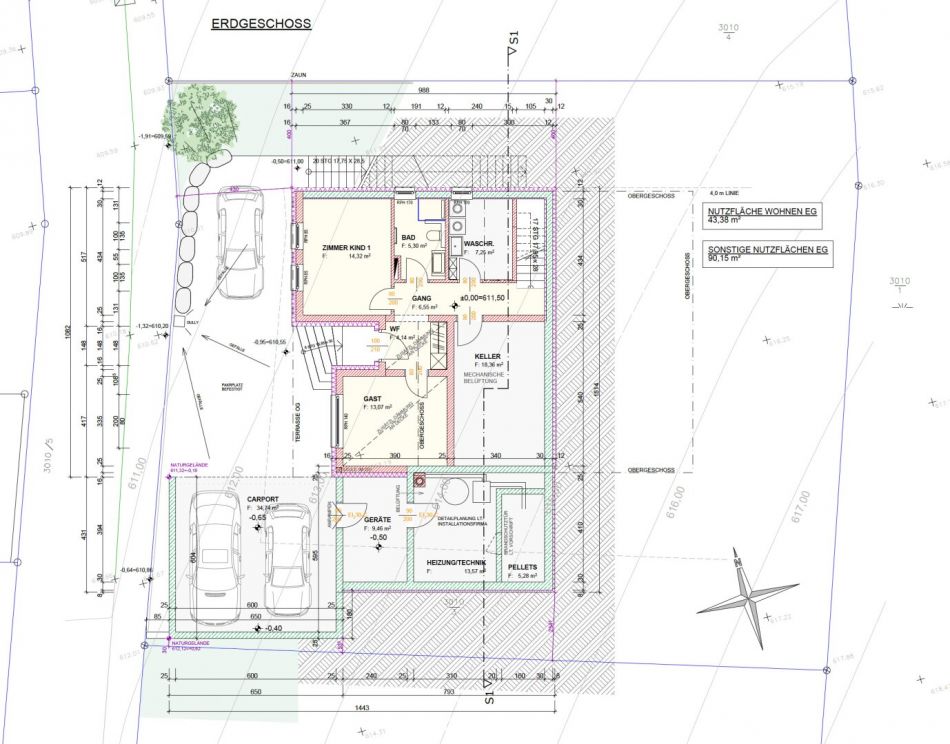 Das Carport (34,74 m²) bietet Platz für zwei Autos und ist direkt mit dem Haus verbunden, sodass man trockenen Fußes das Gebäude betreten kann. Zwei separate Technik- und Lagerräume für Geräte, Heizung und Pellets bieten reichlich Stauraum und unterstreichen die praktische Seite dieses Wohnhauses. Besonders die Technikräume könnten von einer separaten Wohneinheit im Erdgeschoss genutzt werden.