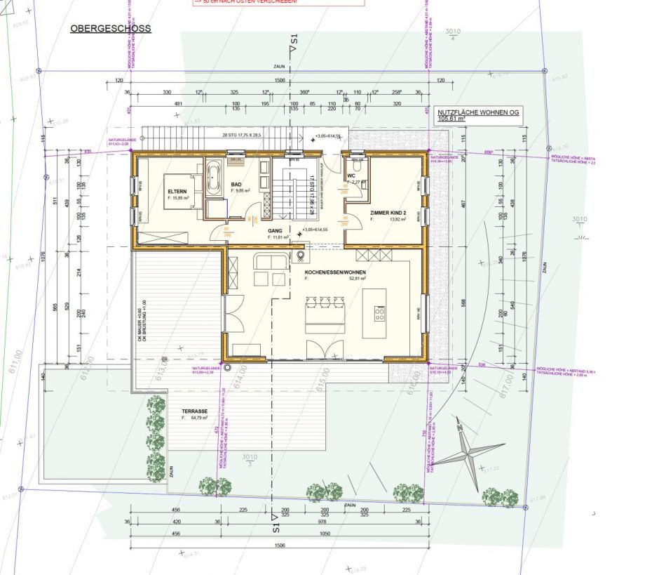 Im Obergeschoss öffnet sich der zentrale Bereich des Hauses. Der offene Wohn-/Ess- und Küchenbereich (52,81 m²) strahlt dank großer Fensterfronten und direktem Zugang zur großzügigen Terrasse (64,79 m²) eine besonders freundliche und lichtdurchflutete Atmosphäre aus. Dieser Bereich ist ideal für gemeinsame Familienaktivitäten, bietet aber auch genug Rückzugsorte und durch den Kamin mit modernem Holzofen ein einzigartiges Wohlfühlambiente.