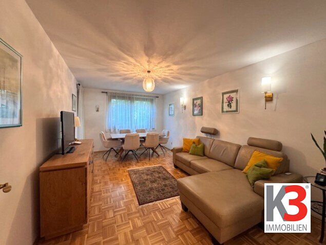 Ess-/Wohnbereich - Ebenso wie im Vorraum, im Schlaf- und im Kinderzimmer ist auch hier ein Parkettboden verlegt. Ein doppelflügeliges Fenster sowie eine Balkontüre für den direkten Zugang auf die Loggia sorgen für viel Lichteinfall. Derzeit ist der Raum mit einer großen Couch, einer Kommode für die Fernsehecke sowie einem großen Esstisch eingerichtet, welcher auch Platz für größere Tafelrunden bietet.