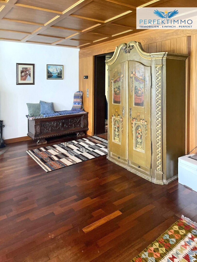 Beim Betreten des Hauses empfängt Sie zunächst ein kleiner, geschützter Eingangsbereich, der Sie in das elegante Foyer führt. Ein stilvoller, großzügiger Einbauschrank bietet ausreichend Platz für Ihre Garderobe und zusätzlichen Stauraum für alltägliche Dinge. Vom Foyer aus öffnet sich eine große hölzerne Schiebetür, die den Weg in das Herzstück des Hauses freigibt: das imposante, über 51 m² große Wohnzimmer. Dieser lichtdurchflutete Wohnbereich wird durch seine raumhohen Fensterfronten dominiert, die einen atemberaubenden Blick auf die Nordkette bieten und den Raum mit Tageslicht durchfluten. Abends sorgen die funkelnden Lichter Innsbrucks für eine stimmungsvolle Atmosphäre. Der klassische Kachelofen verleiht dem Wohnzimmer eine behagliche Wärme und macht es zu einem idealen Ort für gemütliche Stunden mit der Familie.