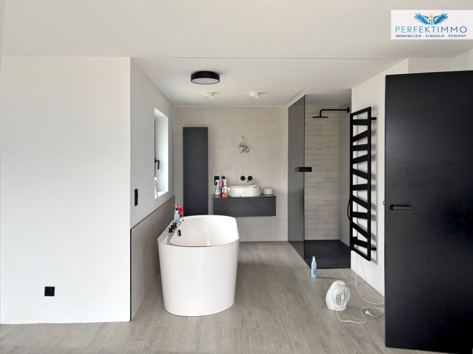 Ein besonderes Highlight ist das größte der Schlafzimmer, das mit einer integrierten privaten Wellnessoase ausgestattet ist. Eine luxuriöse freistehende Badewanne, eine moderne Dusche und ein stilvolles Waschbecken verwandeln diesen Raum in eine Rückzugsoase der Extraklasse. Ein französischer Balkon mit spektakulärem Blick auf die Nordkette unterstreicht den exklusiven Charakter dieses Master-Bedrooms. Neben den Schlafzimmern befindet sich im Obergeschoss ein weiteres, elegant gestaltetes Badezimmer mit Dusche, WC und Waschbecken. Abgerundet wird das Raumangebot durch einen großzügigen Dachboden, der aufgrund seiner Größe und Raumhöhe als zusätzliches Zimmer genutzt werden könnte.