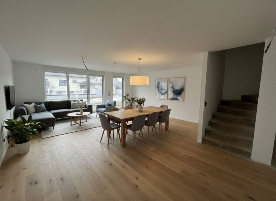 „Die dargestellten Möbel und Einrichtungsgegenstände dienen der besseren räumlichen Vorstellung und wurden mittels KI visualisiert. Sie sind nicht Bestandteil der tatsächlichen Ausstattung der Immobilie.“