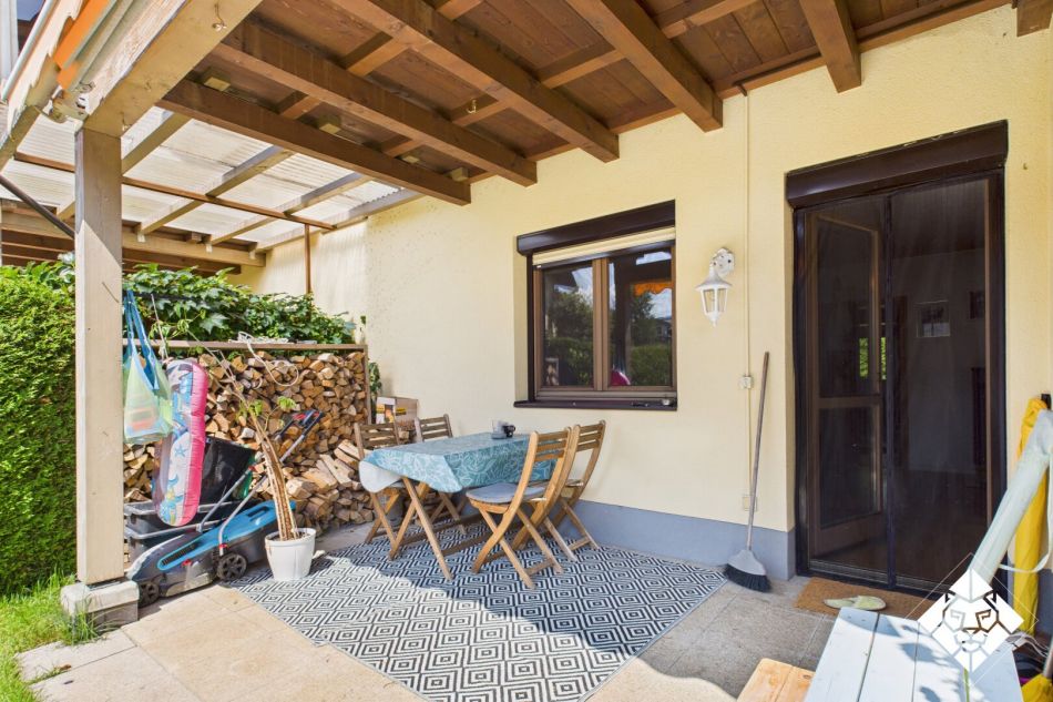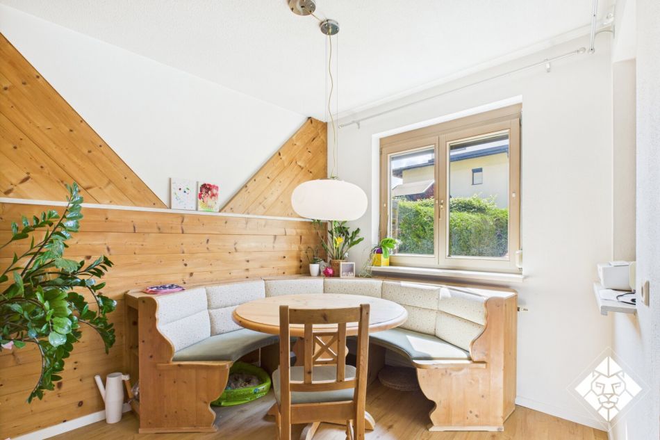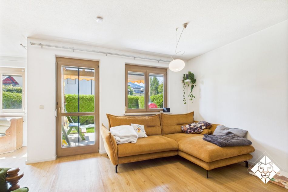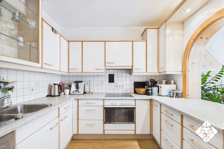 Die Einbauküche ist perfekt eingebettet und lädt zu genussvollen Momenten ein, während der direkte Zugang zur Terrasse und zum eigenen Garten den Wohnbereich um eine idyllische Outdoor-Oase erweitert.