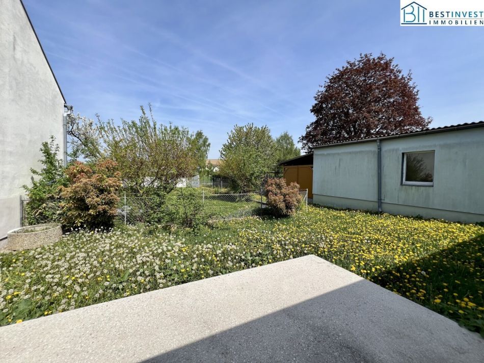 Vom Wohnzimmer (offene Decke) aus gelangt man über eine Terrasse in den Garten, die schöne Stunden im Freien versprechen.
