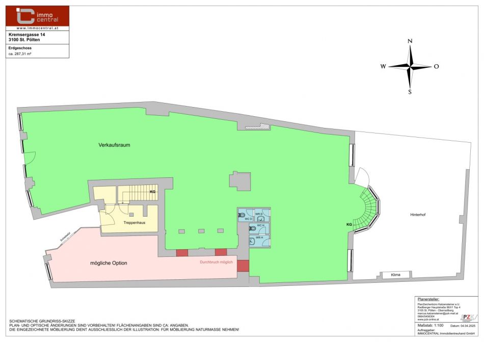 Standortbeschreibung / Wirtschaftliches Umfeld: Die Immobilie befindet sich in zentraler Lage in der Kremser Gasse, nur zwei Gehminuten vom Hauptbahnhof entfernt. In direkter Umgebung sind angesagte Marken, erstklassige Gastronomiebetriebe sowie zahlreiche Dienstleister wie Juristen, Ärzte, Apotheken und Therapeuten ansässig. Das markante Gebäude besticht durch seine prominente Präsenz im Straßenbild und bietet einen optimalen Standort für nationale wie auch internationale Marken.Flächenangaben und Barrierefreiheit: Der Zugang zur Immobilie erfolgt direkt über die Kremser Gasse. Die Gesamtfläche beläuft sich aktuell auf etwa 356,44 m².