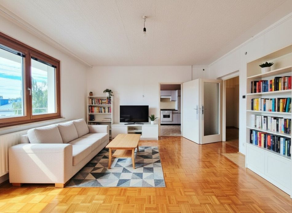 Diese außergewöhnlich gut geschnittene Wohnung vereint Großzügigkeit, klare Struktur und viel Gestaltungsfreiheit. Die durchdachte Raumaufteilung, die sonnige Süd-Westausrichtung und gleich zwei Zugänge zur Loggia schaffen ein Wohngefühl, das Komfort und Potenzial ideal verbindet. Der einladende Vorraum bildet den Auftakt: Von hier aus erreichen Sie Gäste-WC, Garderobe und Abstellraum. Herzstück der Wohnung ist das lichtdurchflutete Wohnzimmer, westseitig orientiert, mit direktem Zugang zur Loggia. Ein angrenzendes Schlafzimmer bietet sich als ruhiger Rückzugsort an. Die eigenständige Küche, ebenfalls mit Loggia Zugang, ist sowohl vom Vorraum als auch vom Wohnzimmer aus erreichbar, ein praktischer Pluspunkt im Alltag. Über einen separaten Innenflur öffnen sich zwei weitere, getrennt begehbare Schlafzimmer, ein Badezimmer sowie ein großzügiger Abstell- bzw. Schrankraum mit Fenster