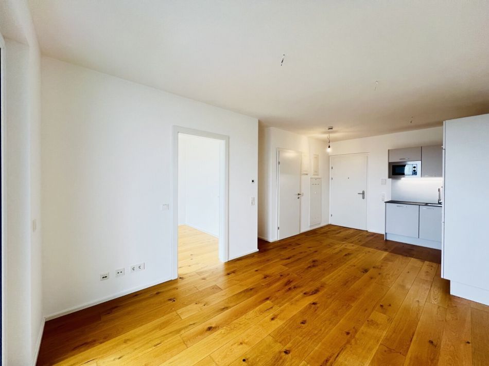 Die Wohnung gliedert sich in: Vorraum, Wohnküche, Schlafzimmer, Badezimmer mit Walk-In Dusche und WC, Loggia und Balkon