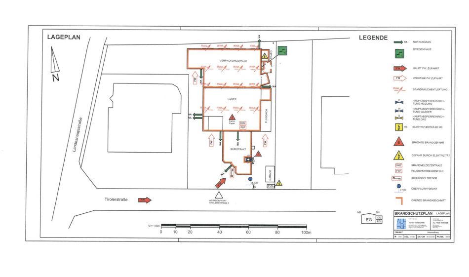 Dokumentiert und genehmigt sind: Brandmeldeanlage im Vollschutz nach TRVB S 123, Brandrauchentlüftung in der Halle, Blitzschutzanlage nach ÖVE/ÖNORM sowie weitere brandschutz- und anlagentechnische Maßnahmen. Für Nutzer mit Produktions- oder Verarbeitungshintergrund bedeutet das: monatelange Genehmigungsverfahren und erhebliche Investitionen in die Gebäudetechnik entfallen.