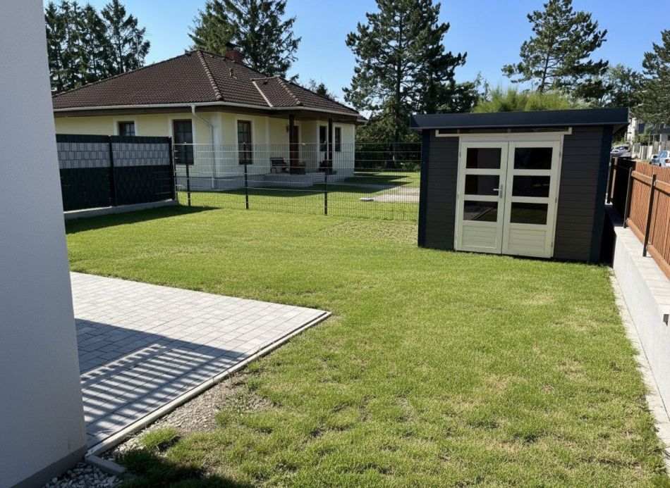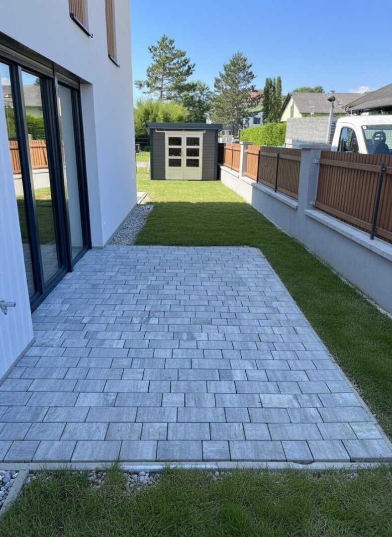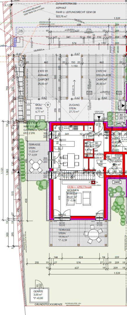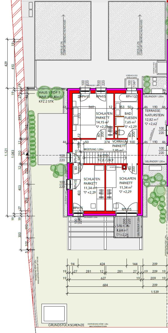 Die Grundstücke sind über eine neu geschaffene Zufahrtstraße nordöstlich der öffentlichen Leopold Lehnerstraße erschlossen. Jeder Doppelhaushälfte sind nördlich zwei Carports mit jeweils zwei KFZ-Abstellplätzen, eine Müllsammelstelle sowie eine Fahrradabstellmöglichkeit zugeordnet. Darüber hinaus verfügt jede Doppelhaushälfte über einen großzügigen Eigengarten mit ca. 180 m². In jedem Garten befindet sich zudem ein praktischer Geräteschuppen mit ca. 3 m² Fläche.