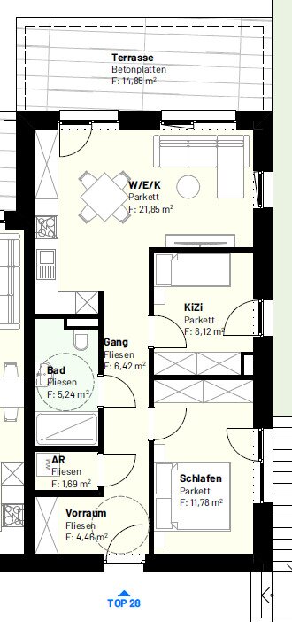Vorraum – Abstellraum – Bad mit WC – Wohnküche – Schlafzimmer – Kinderzimmer - Loggia