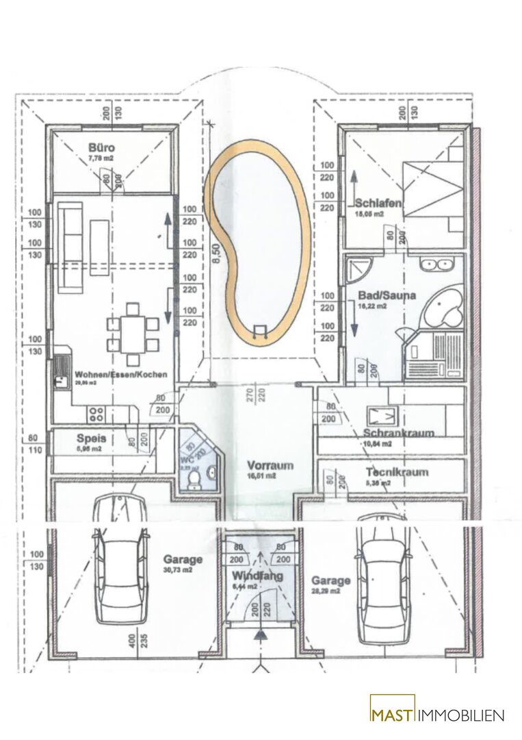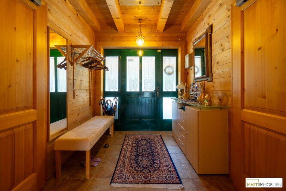 In der Zufahrt des Hauses befinden sich 2 separat zu befahrene Garagen mit direkten Zugang ins Haus. Neben dem Haus befindet sich des weiteren ein Stellplatz inkl. Carport. Der Eingangsbereich mit ca. 6,50 m² bietet ausreichend Platz für Ihre Garderobe, sollte das nicht reichen, gibt es immer noch ein Vorzimmer mit ca. 16,30 m². Die Wohnküche umfasst eine Fläche von ca. 29 m² und wurde mit einer hochwertigen Küche inkl. Geräte ausgestattet und ist im Kaufpreis inkludiert. Nach dem Wohnzimmer befindet sich ein Büro mit ca. 7,60 m² dass sich auch als Gäste- oder kleines Kinderzimmer eignet. Das Master Schlafzimmer befindet sich gegenüber des Wohnbereichs nach dem "überdachten Indoorpool" und ist mit knapp 15 m² ausreichend groß und bietet aufgrund der Gartenausrichtung absolute Ruhe. Für Ihre Garderobe gibt es einen großen und extrahohen Schrankraum im Ausmaß von ca. 10,50 m². Das modern gestaltete Badezimmer verfügt über eine Dusche, Sauna, Solarium, Doppelwaschbecken und WC. Sämtliche Schiebetüren und Fenster sind mit Insektenschutzgitter ausgestattet.
