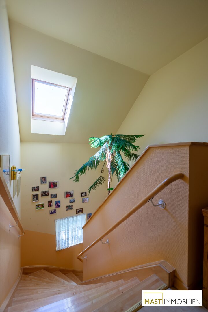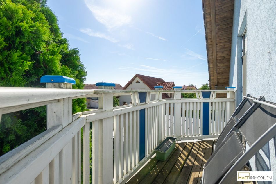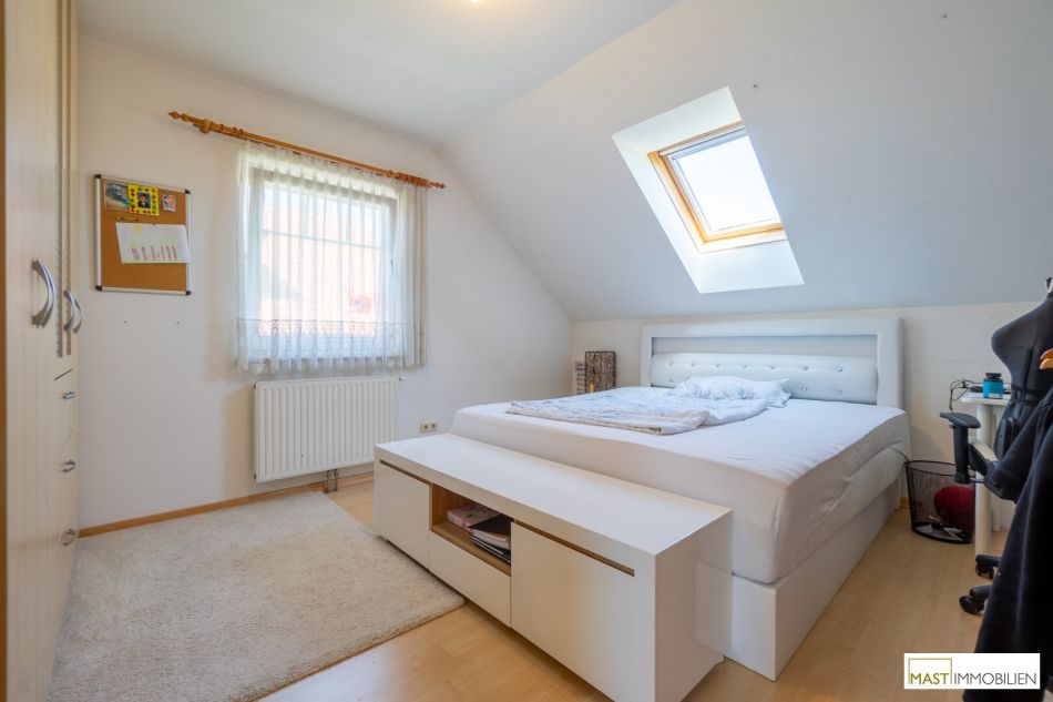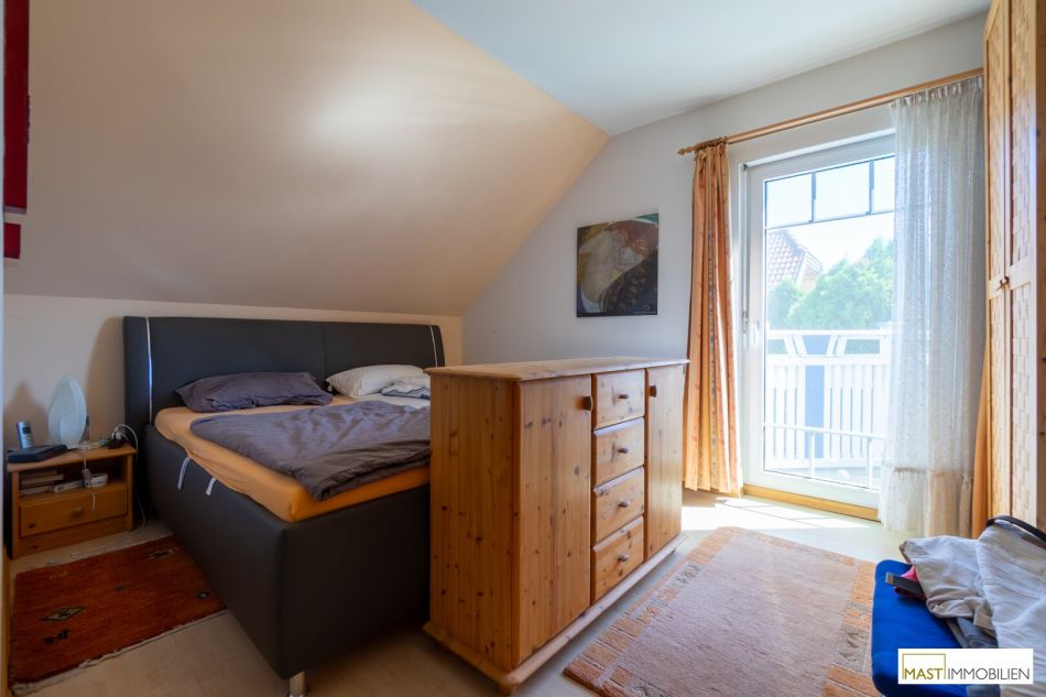 Im Obergeschoss befinden sich 3 Schlafzimmer und ein Badezimmer mit Badewanne und Dusche. Der Balkon mit westlichen Ausblick ist von 2 Schlafzimmer aus begehbar.