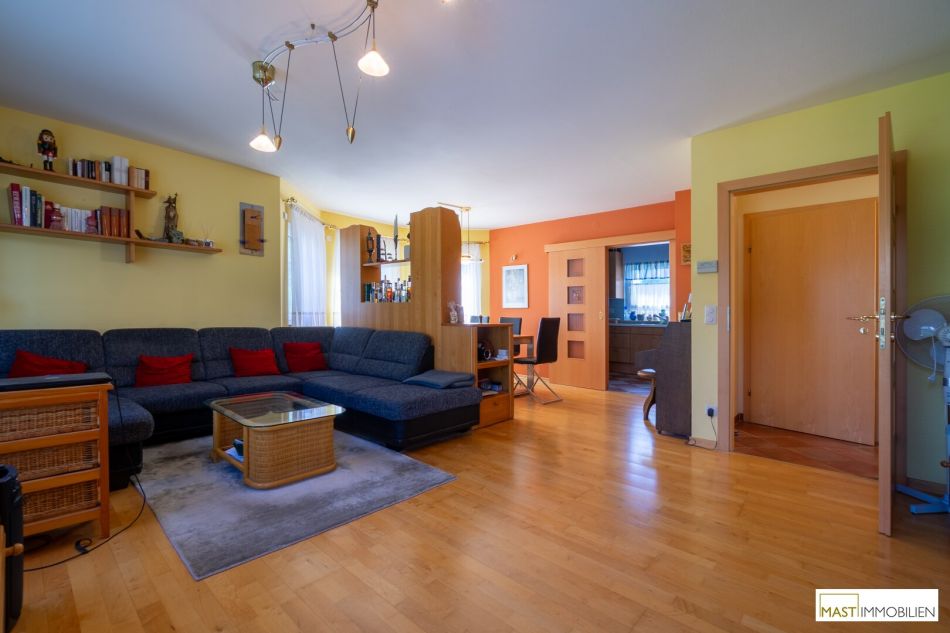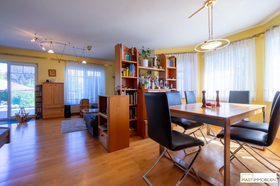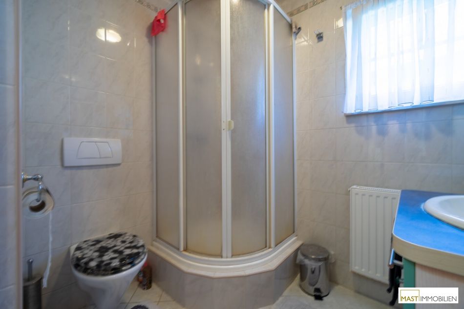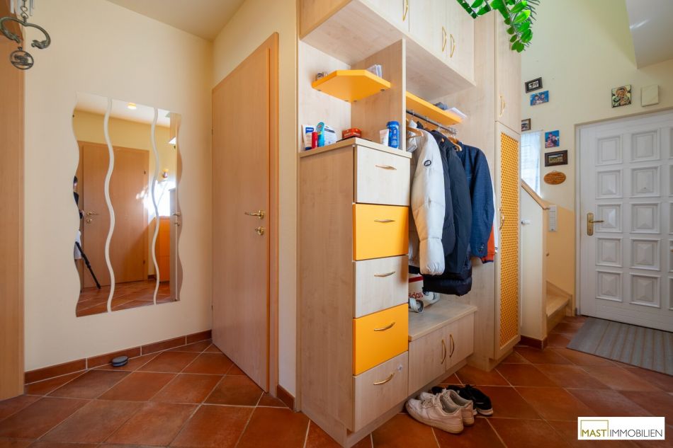 Nach Eintritt in dies Haus gelangen Sie in großzügiges Vorzimmer mit ca. 8,20 m² und bietet direkten Zugang in sämtliche Räumlichkeiten und in den Keller bzw. ins Obergeschoss. Das sep. WC mit Dusche ausgestattet mit Waschbecken ist knapp 4 m² groß, direkt daneben befindet sich ein ca. 3 m² großer Abstellraum. Der Wohn- & Speisebereich bietet ca. 34 m² und auch direkten Zugang auf die ruhige und uneinsichtige Terrasse. Zwischen dem Wohnbereich und der voll ausgestatteten Küche (ca. 9 m²) befindet sich eine nichttragende Wand. Somit kann das Wohnzimmer auf ca. 44 m² vergrößert werden. Besonders Highlight ist das ca. 14 m² Zimmer im Erdgeschoss dass im höheren Alter oder auch Familien mit 3 Kindern optimalen Komfort bietet.