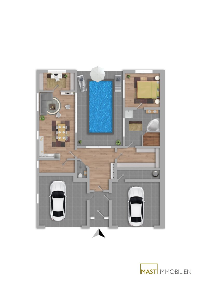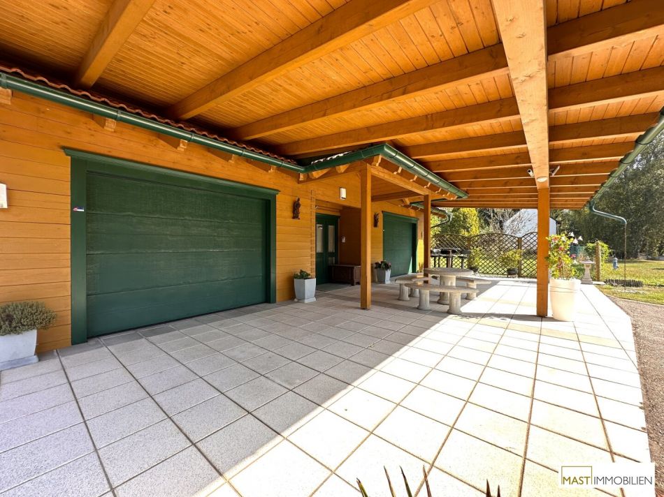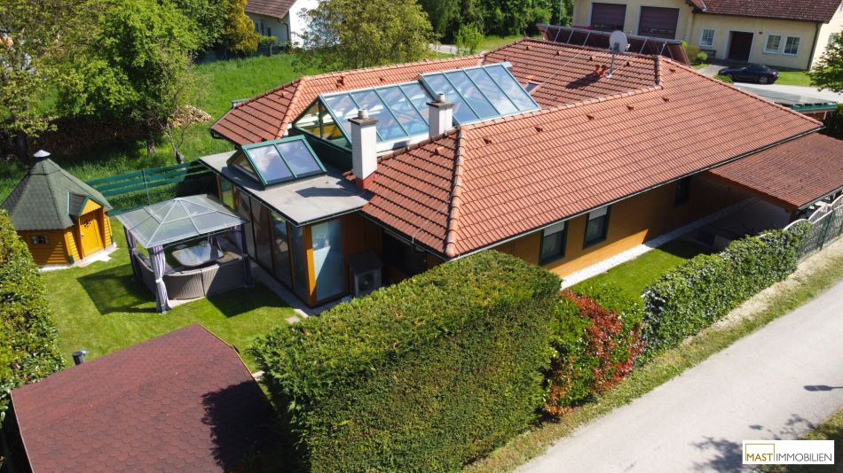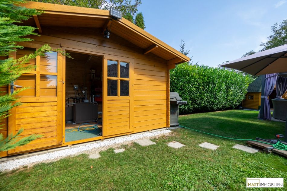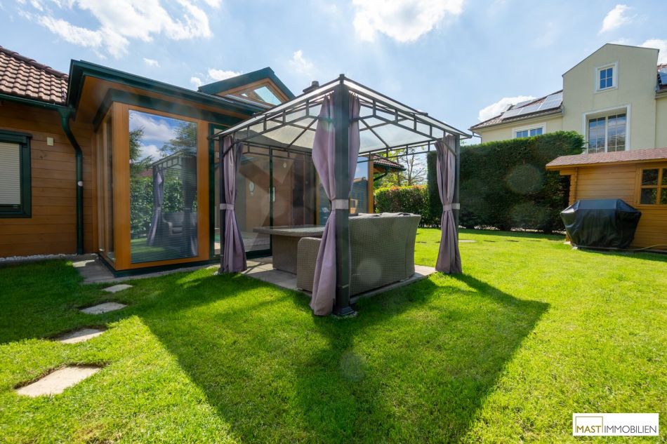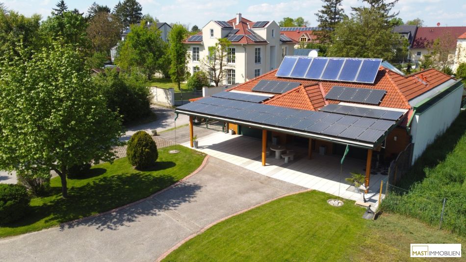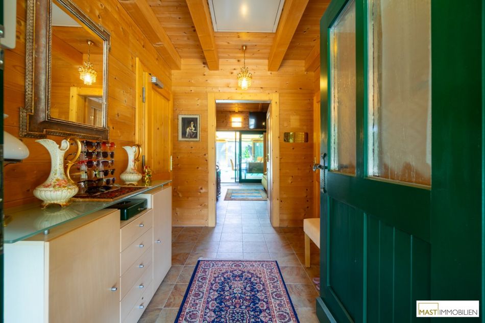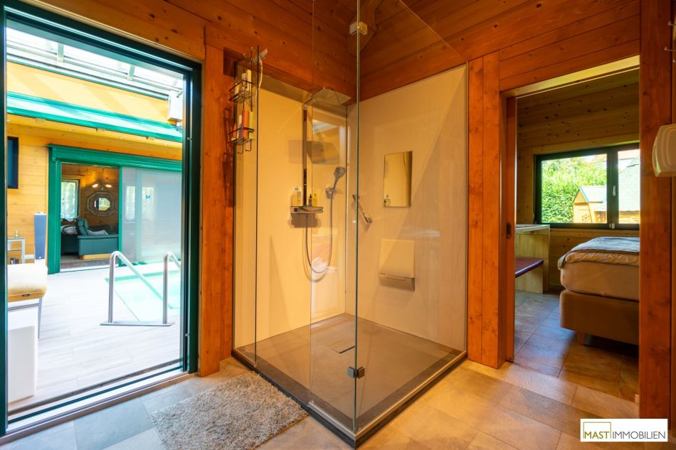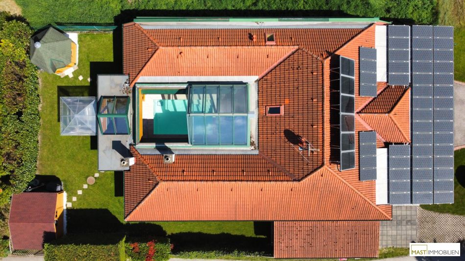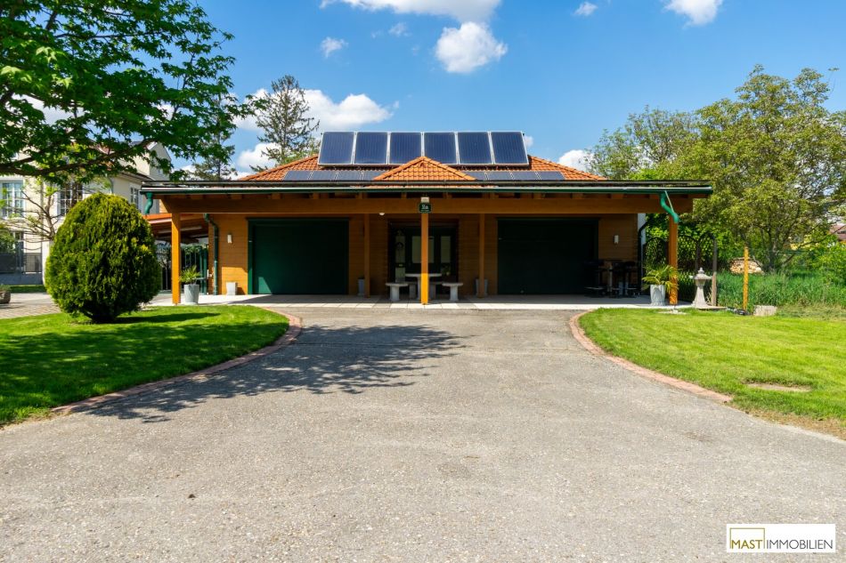 In der Zufahrt des Hauses befinden sich 2 separat zu befahrene Garagen mit direkten Zugang ins Haus. Neben dem Haus befindet sich des weiteren ein Stellplatz inkl. Carport. Der Eingangsbereich mit ca. 6,50 m² bietet ausreichend Platz für Ihre Garderobe, sollte das nicht reichen, gibt es immer noch ein Vorzimmer mit ca. 16,30 m². Die Wohnküche umfasst eine Fläche von ca. 29 m² und wurde mit einer hochwertigen Küche inkl. Geräte ausgestattet und ist im Kaufpreis inkludiert. Nach dem Wohnzimmer befindet sich ein Büro mit ca. 7,60 m² dass sich auch als Gäste- oder kleines Kinderzimmer eignet. Das Master Schlafzimmer befindet sich gegenüber des Wohnbereichs nach dem "überdachten Indoorpool" und ist mit knapp 15 m² ausreichend groß und bietet aufgrund der Gartenausrichtung absolute Ruhe. Für Ihre Garderobe gibt es einen großen und extrahohen Schrankraum im Ausmaß von ca. 10,50 m². Das modern gestaltete Badezimmer verfügt über eine Dusche, Sauna, Solarium, Doppelwaschbecken und WC. Sämtliche Schiebetüren und Fenster sind mit Insektenschutzgitter ausgestattet.