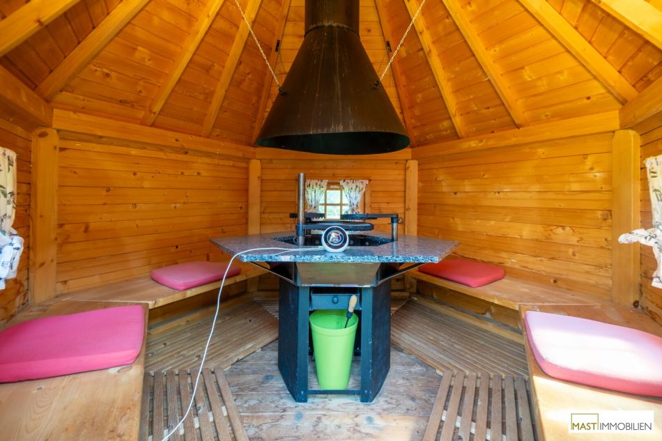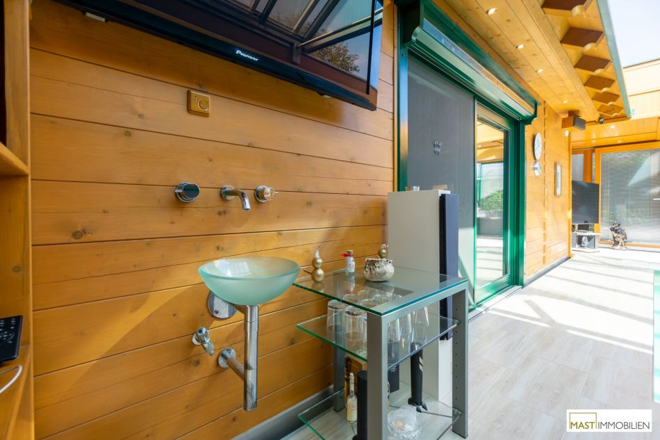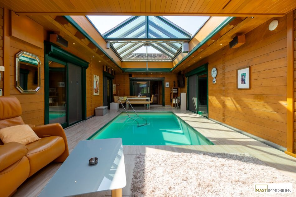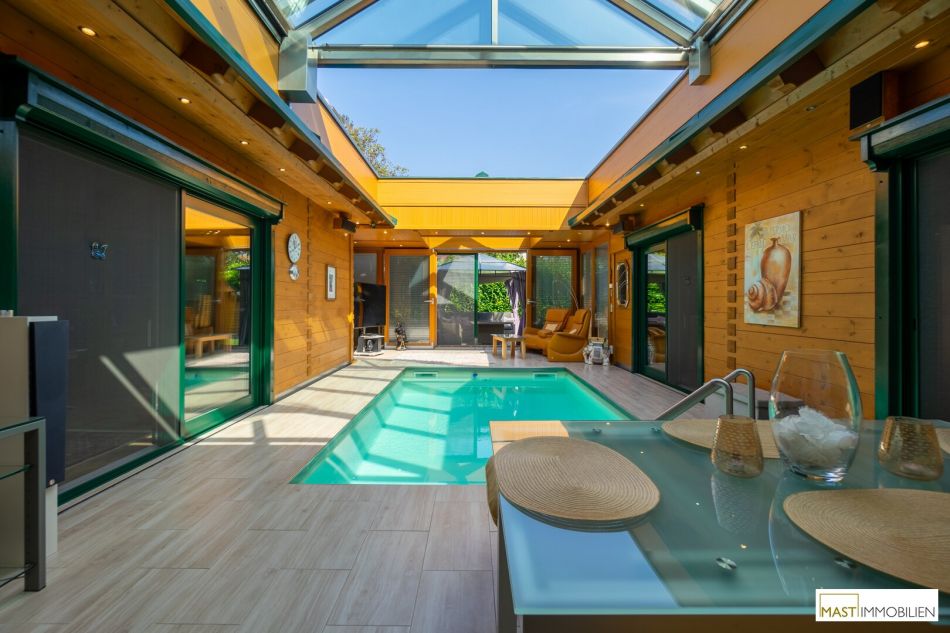 Besonderes Highlight ist der 5x3 große Indoorpool der ganzjährig zum relaxen einlädt. Alternativ lässt sich das Glasdach über dem Pool elektrisch öffnen.