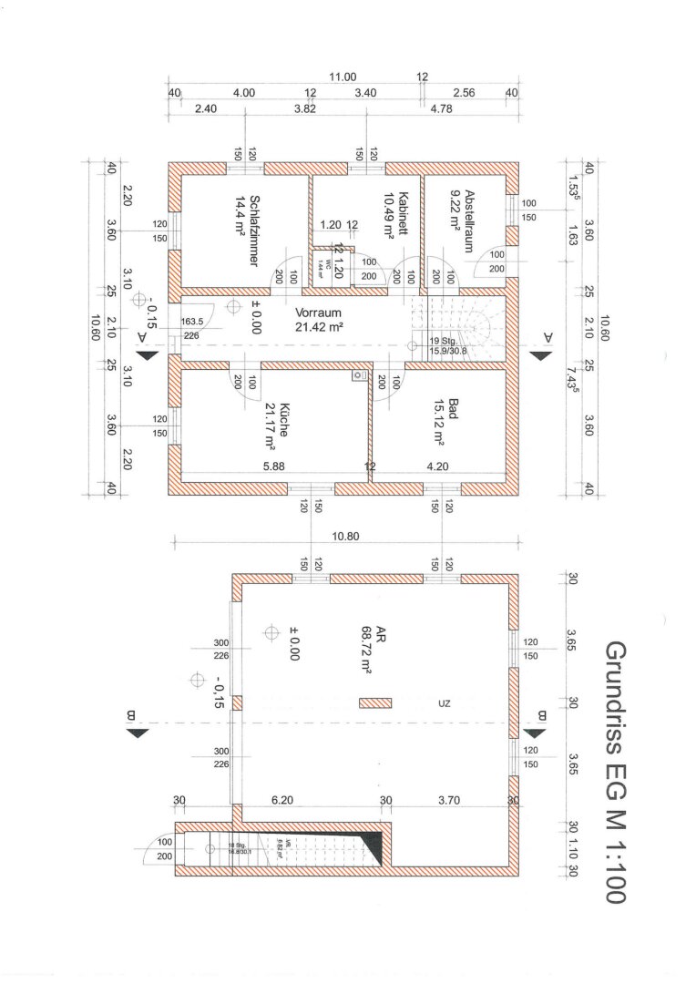 Das Wohnhaus wurde 1970 nach dem beiliegenden Einreichplan in Massivbauweise mit Vollkeller (116m²) , Wohngeschoß (114 m²) und Satteldach mit Eterniteindeckung vorne an der Landstraße errichtet.