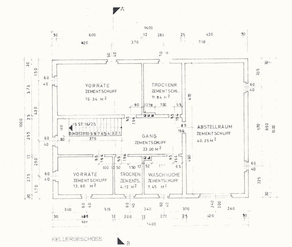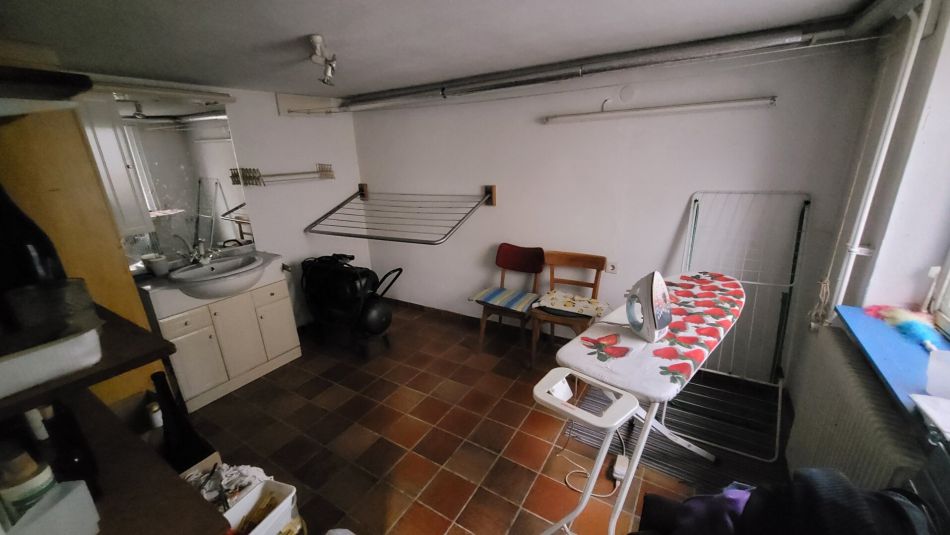 Die vielen Räume im Kellergeschoß haben verschiedene Zwecke: Waschküche, Lagerraum, Zugang zum Wohngeschoß - der große Abstellraum mit einem großen Einfahrtstor vom Innenhof wird als Werkstätte genutzt.