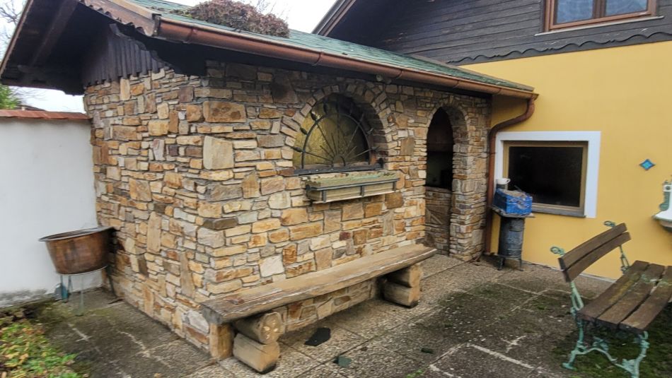 Angebaut an die Doppelgarage wurde aus Natursteinen ein Gartenhaus errichtet, inkl.Terrasse und Grünfläche zum Grillen.