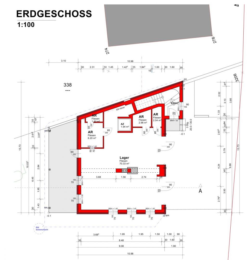 Abweichend vom Einreichplan wurde ein Stiegenhaus rechts an die Doppelgarage angebaut, sodaß eine Grundstücksteilung wegen fehlendem Bauwich (Mindestabstand) unmöglich ist.