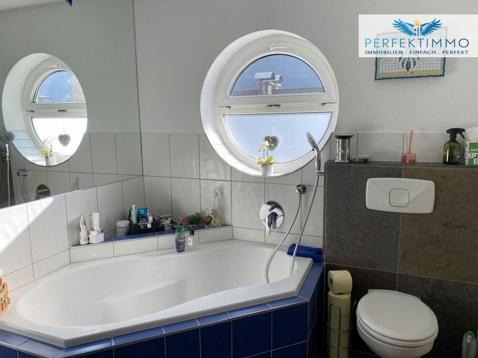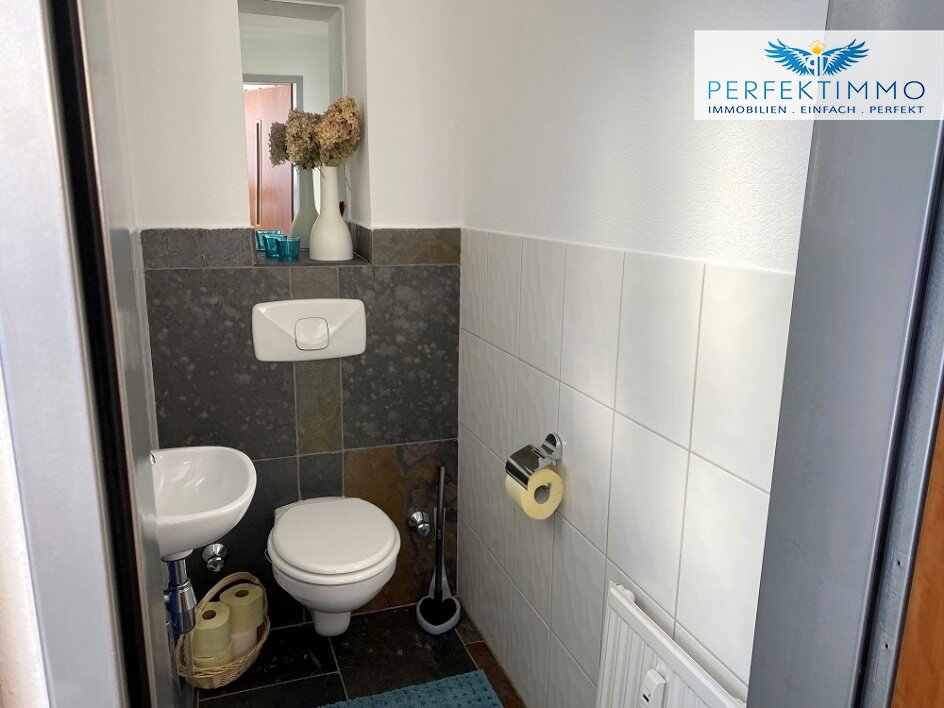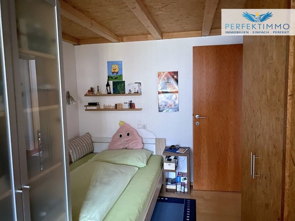 Das Badezimmer überzeugt mit einer großen Badewanne und einer gemauerten Dusche samt Glaseinstiegstüre, Waschbecken mit Wandspiegel, Glasregalen, Waschmaschinenanschluss und Handtuchtrockner. Ein Gäste-WC ist ebenfalls vorhanden. Böden aus Schiefer im Flur, Küchenbereich, Badezimmer und WC sowie Parkett in den Wohnräumen schaffen eine elegante und zugleich wohnliche Atmosphäre. Besonders charmant ist das Kinderzimmer, in dem aufgrund der großzügigen Raumhöhe ein zusätzlicher Bereich über eine kleine Innentreppe erschlossen wurde – ein idealer Rückzugsort für die jüngsten Bewohner.